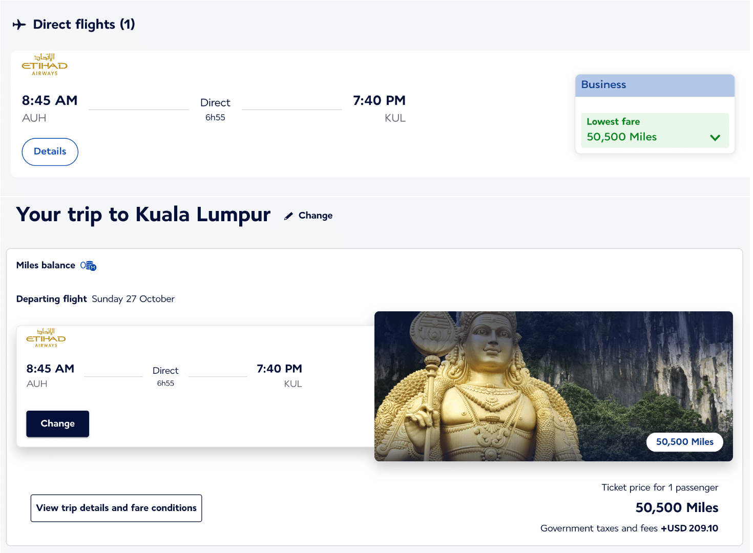 Through the Flying Blue program, you can book a business class flight from Abu Dhabi (AUH) to Kuala Lumpur (KUL) for 50,500 miles, which represents a fantastic deal for a long-haul route in Etihad’s renowned business class.