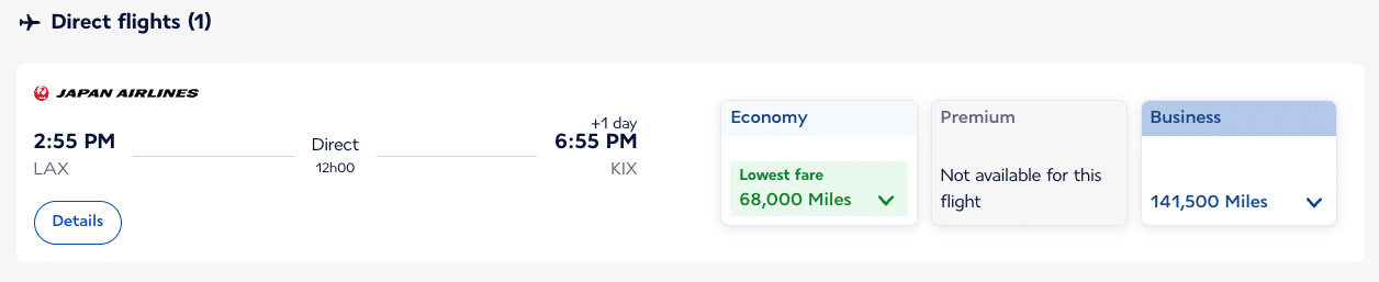 The following two examples aren’t necessarily the best value for points but are included to show what’s possible, as these could be worth considering if you’re keen on trying Japan Airlines or have limited redemption options.