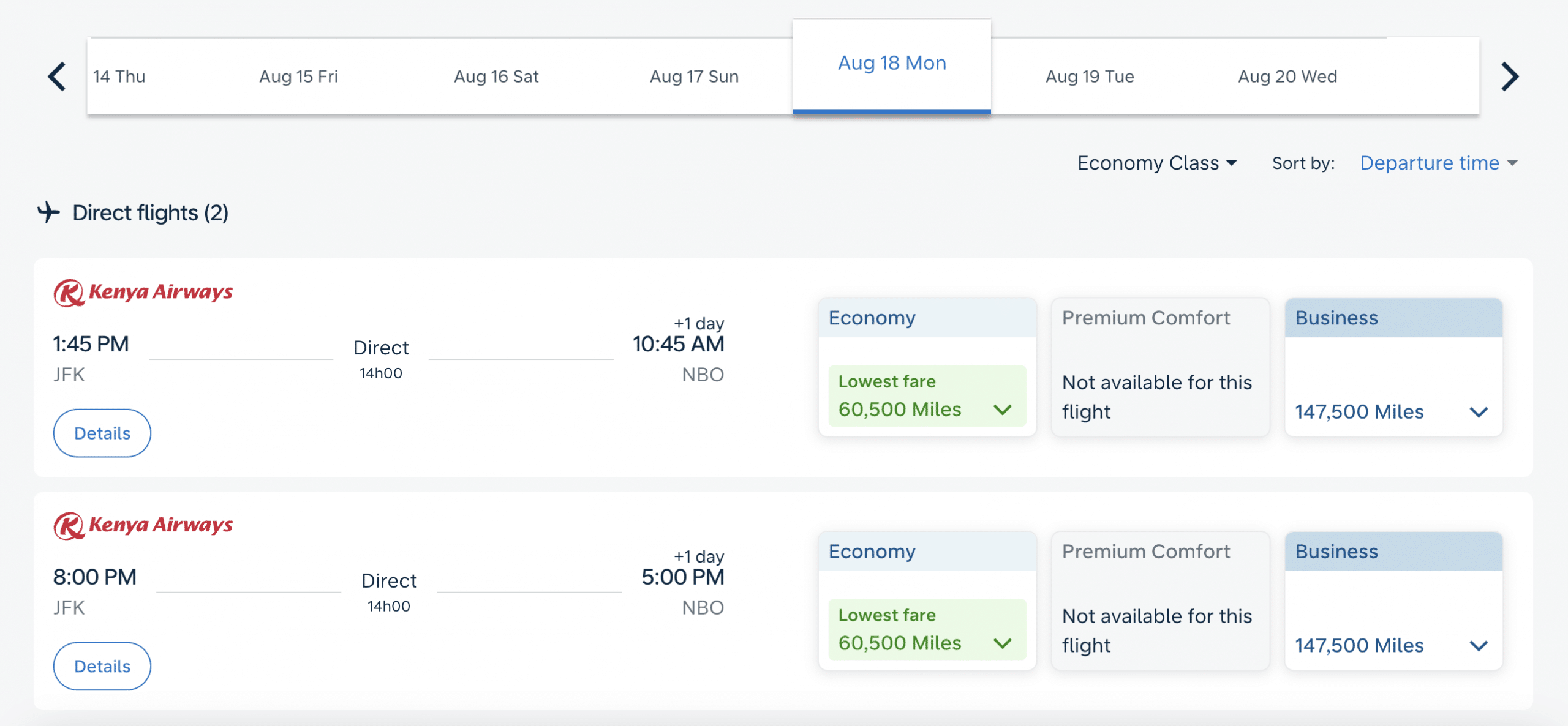 By using your Flying Blue miles for a redemption with Kenya Airways, you could fly from New York (JFK) to Nairobi (NBO) for 60,500 miles in economy, or you could opt for a business class redemption, which comes in at 147,500 miles.