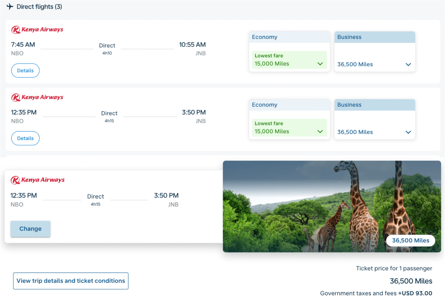If you’d like to continue your journey from Kenya to South Africa, Kenya Airways is also the only airline that flies non-stop from Nairobi (NBO) to Johannesburg (JNB), making it a great option to utilize Flying Blue miles.