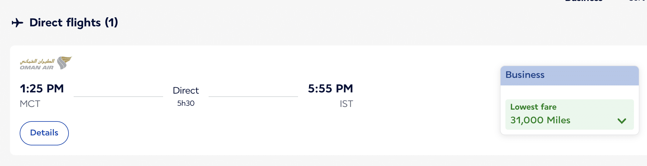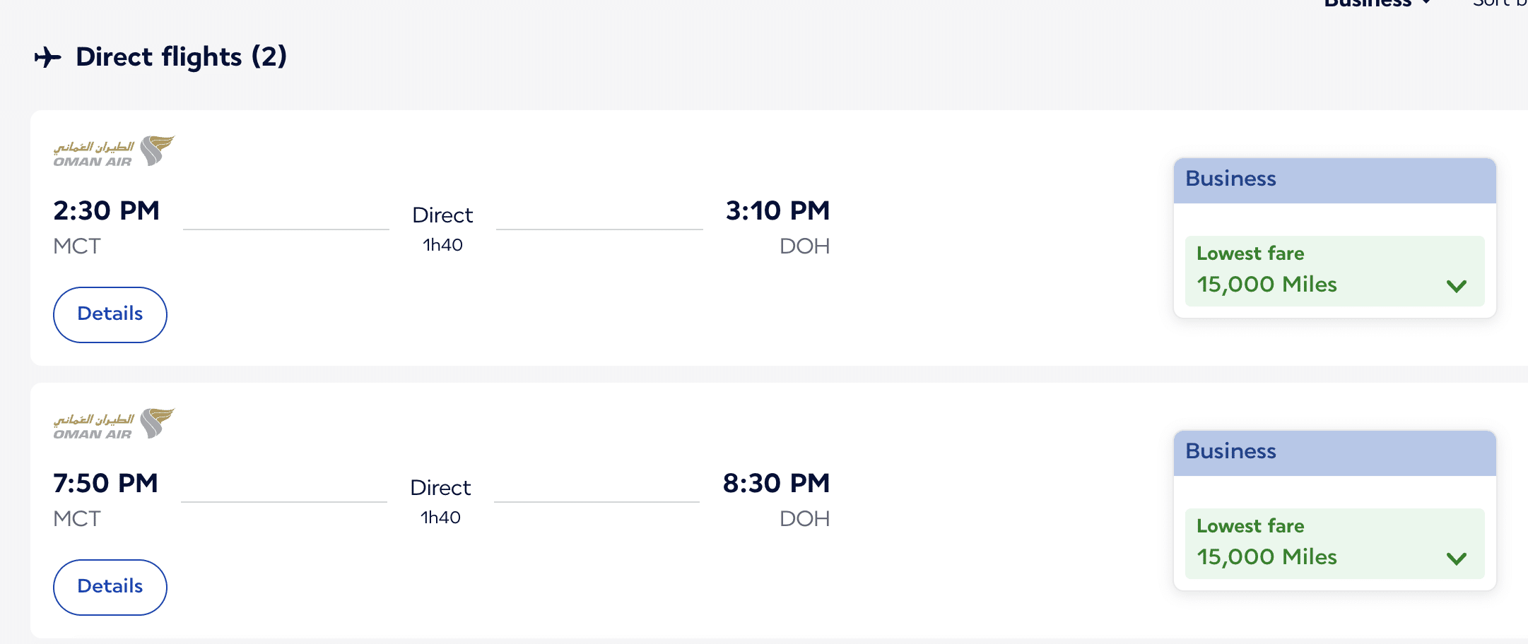 In terms of Flying Blue redemptions with Oman Air, you could book a business class flight from Muscat (MCT) to Doha (DOH) for just 15,000 miles.