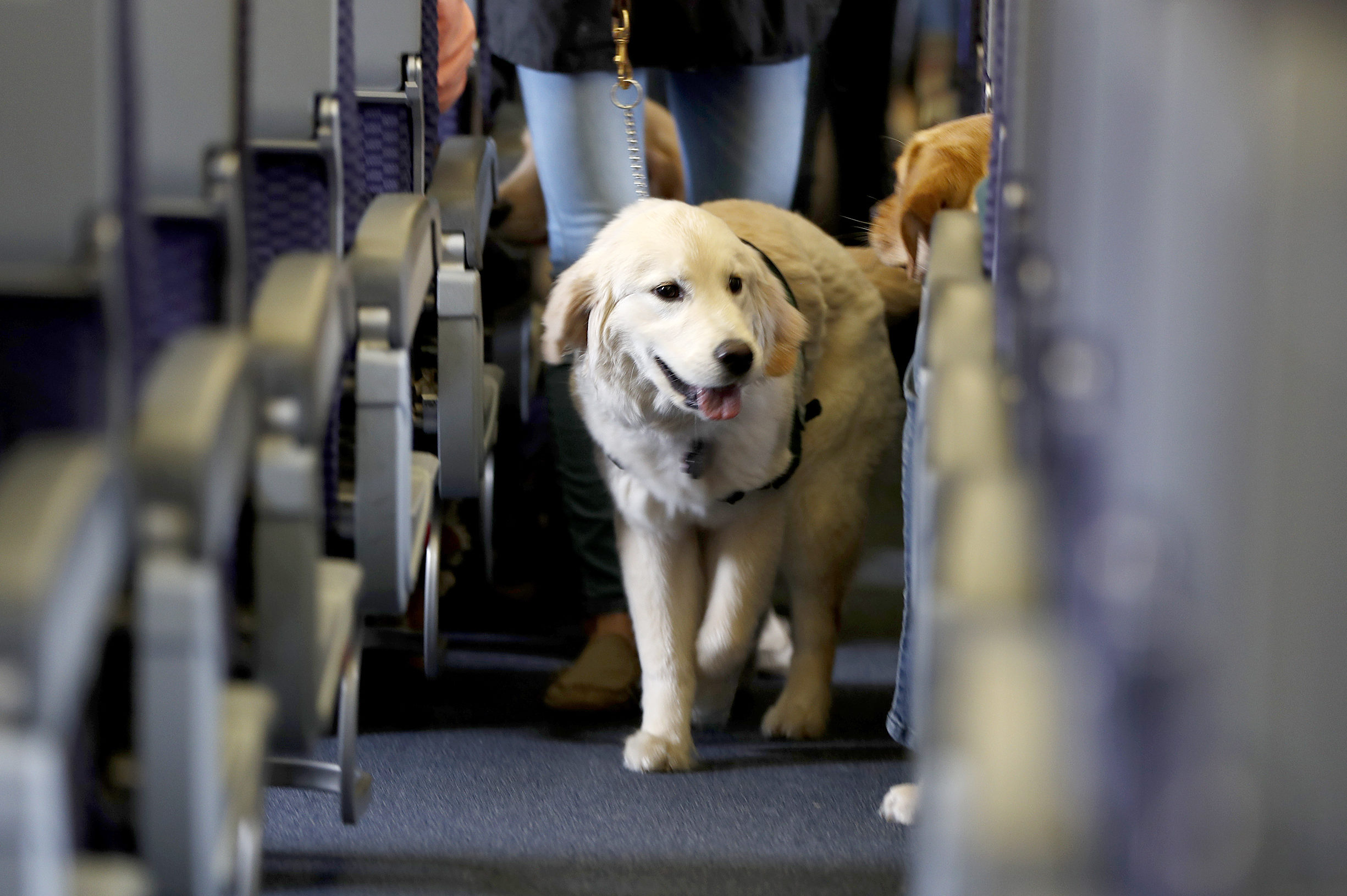 Service dogs accompany passengers with disabilities at the airport and onboard the aircraft, often travelling on the lap or at the feet of the passenger. Airlines will arrange for additional space for your service dog to travel safely and comfortably due to its size. When contacting the airline, they may ask for the breed, length, width, and height to ensure that your service dog will be comfortable.