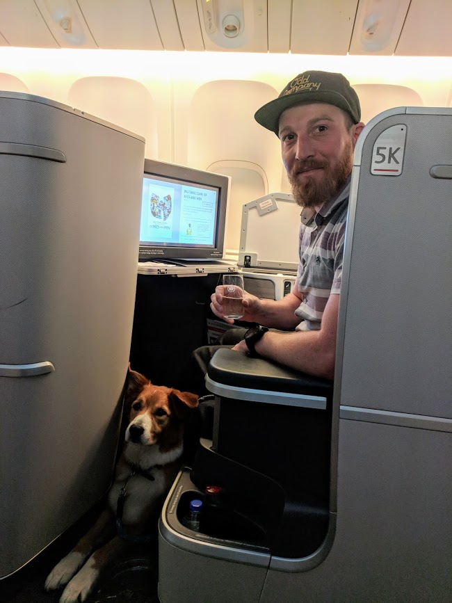 As a medium-sized dog, he does fine in preferred seats in economy, but I find premium economy or North American-style business class seats work best as he can lie down and move around relatively freely (especially when the adjacent seat is empty). Pods are okay, too (they’re pretty much like a den), but due to the flooring being uneven, I think it’s harder for him to get and remain comfortable.