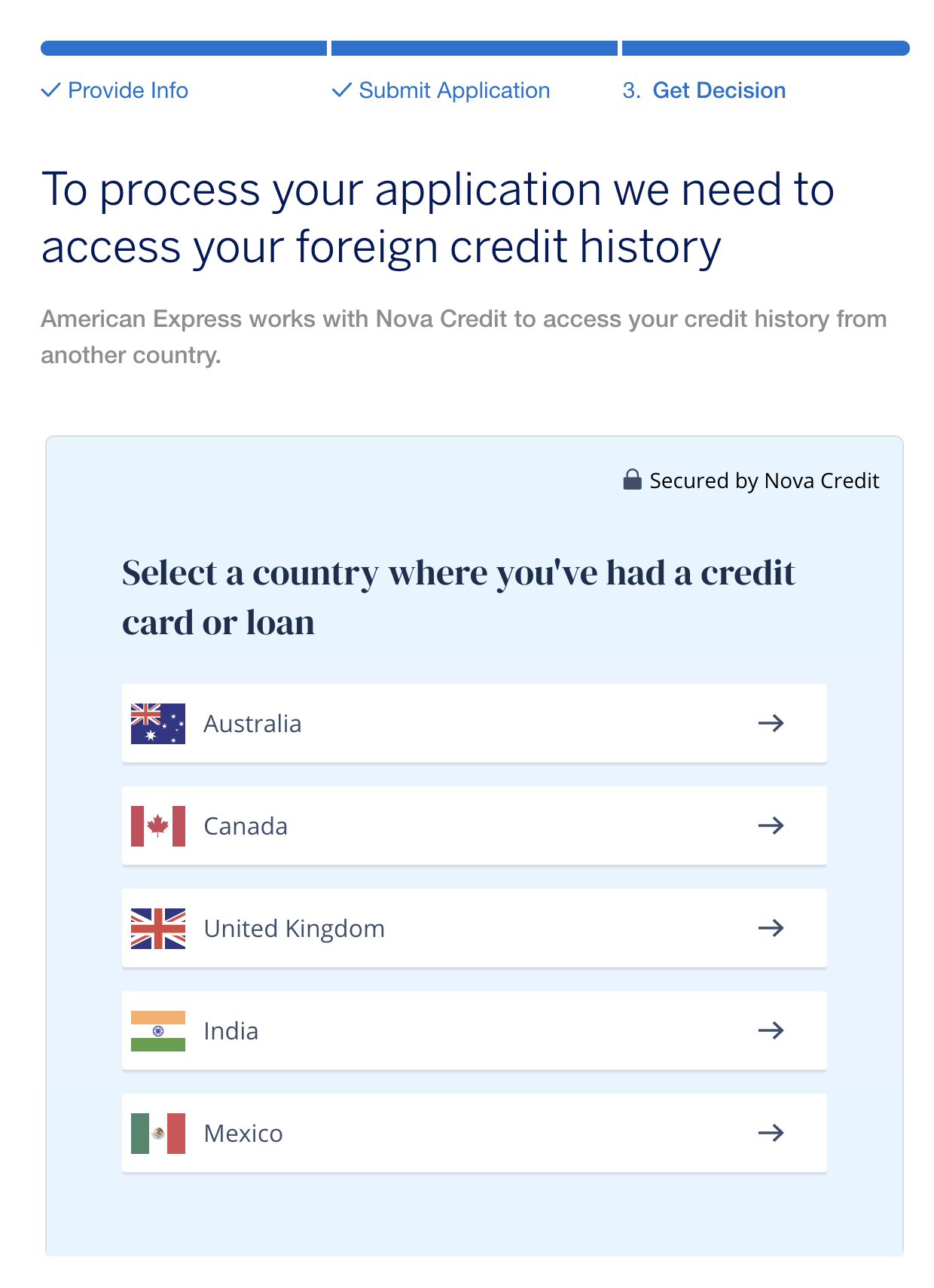 However, Amex US recently made it necessary to have a US SSN or ITIN before you can apply using Nova Credit. Therefore, the below process only works if you have a US SSN or ITIN. If you have neither, then you’ll have to apply via Global Transfer (see above).
