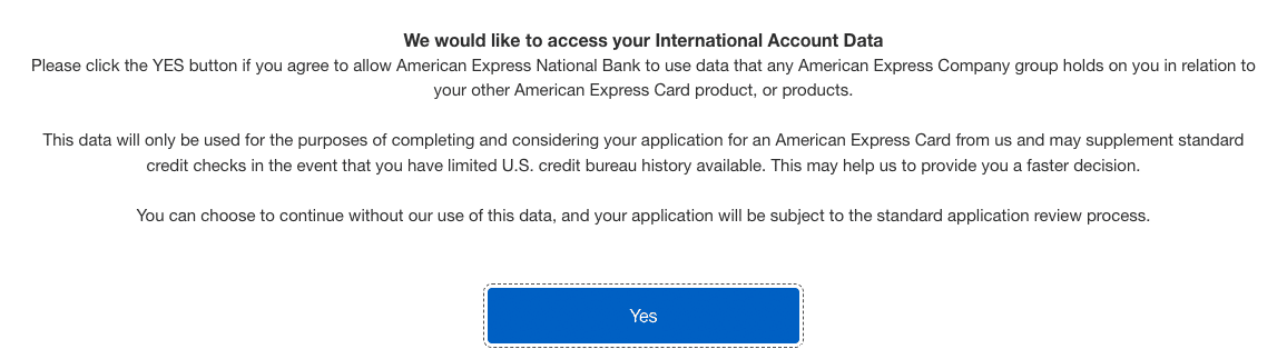 Another popup will appear, and you’ll need to agree to Amex US accessing your Amex account history from another country.