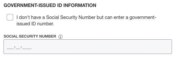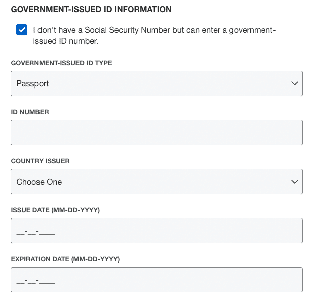 You’ll be asked to provide government-issued ID information. Again, if you don’t have a US SSN or ITIN, check the box that says “I don’t have a Social Security Number but can enter a government-issued ID number”.