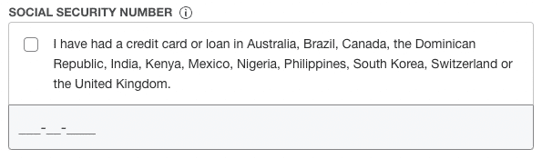 On the Amex US credit card application page, look for the Social Security Number (SSN) box. If you don’t have a US SSN or Individual Taxpayer Identification Number (see below), look for the box that says “I have had a credit card or loan in Australia, Brazil, Canada, the Dominican Republic, India, Kenya, Mexico, Nigeria, Philippines, South Korea, Switzerland, or the United Kingdom”.