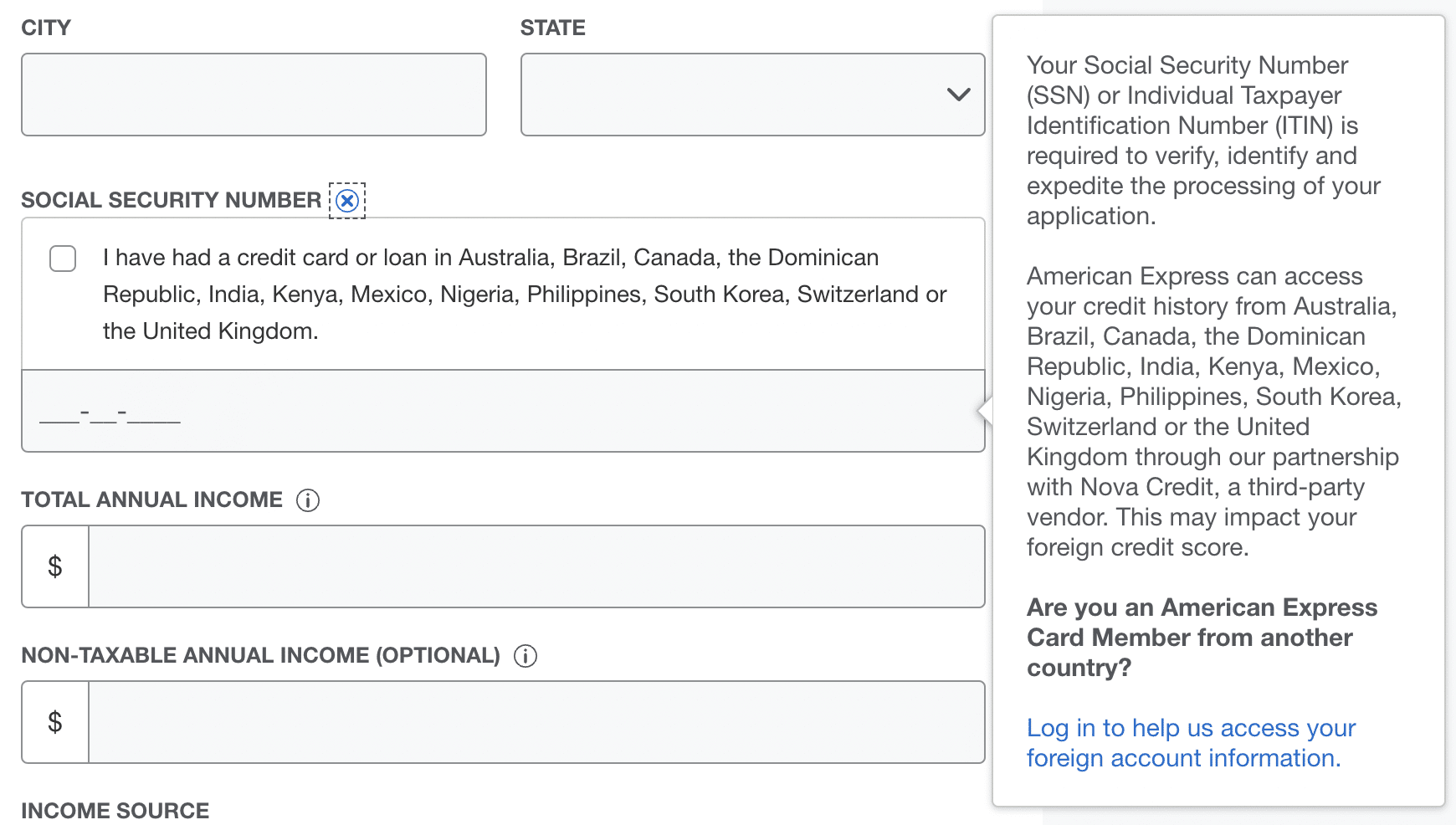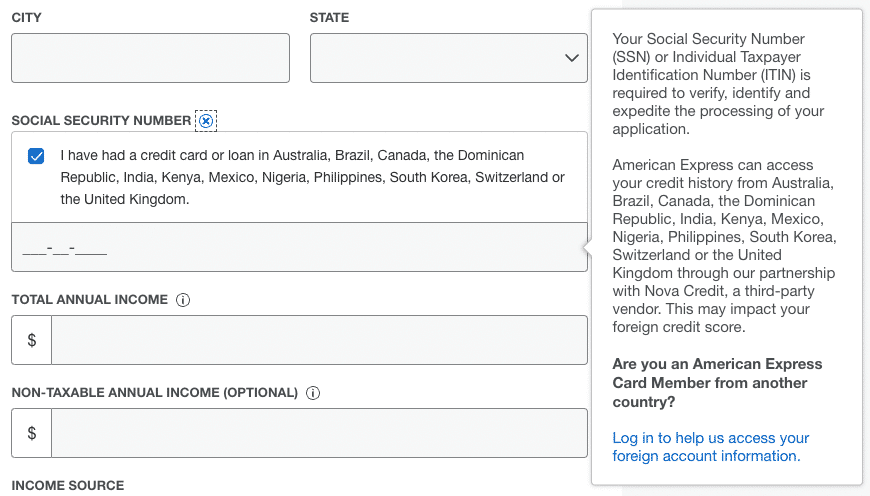 To apply via Nova Credit, open up the application form for any Amex US personal credit card, and then click the “I have had a credit card or loan in… ” checkbox where it asks for your Social Security Number. You’ll also need to add your ITIN or SSN here.