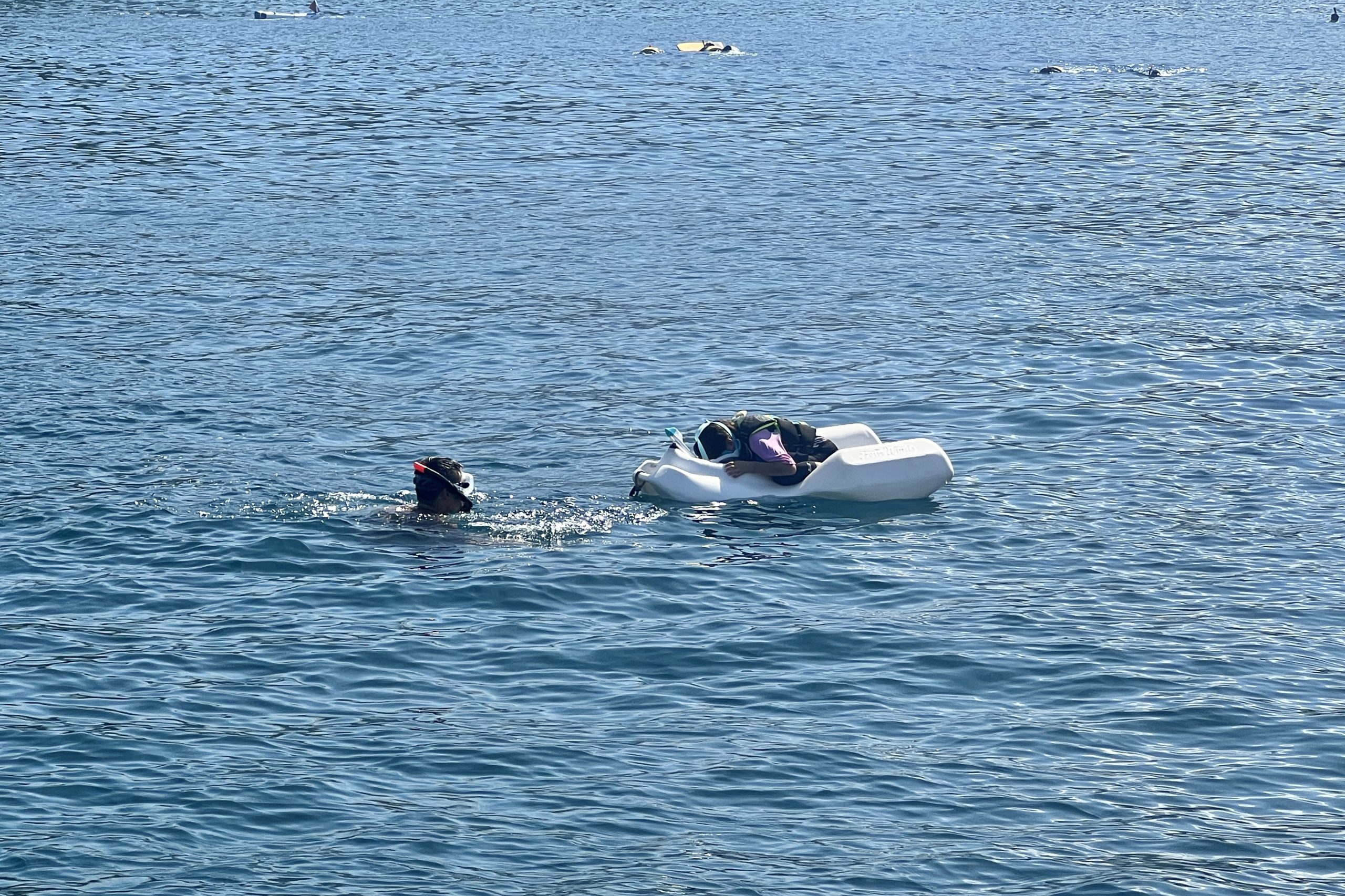If your child is scared to use the snorkel mask, then ask for their See Boards (large flotations with a clear bottom viewing window).
