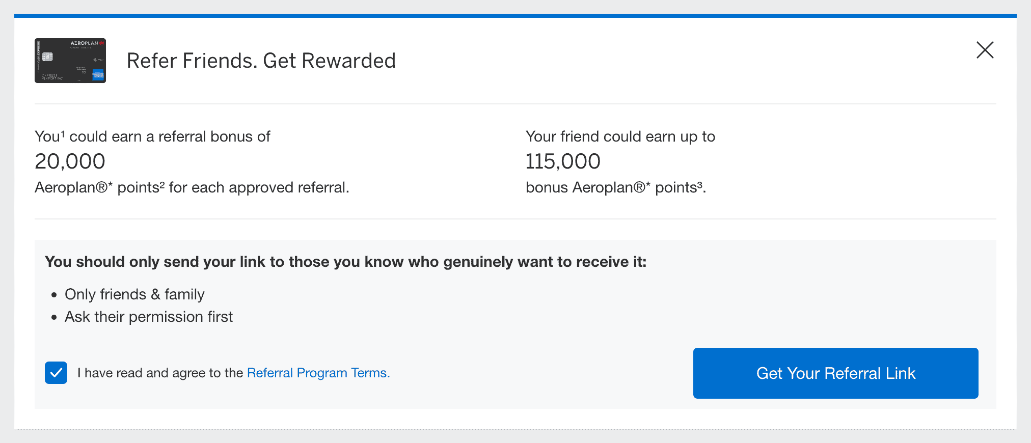 The Aeroplan Reserve cards can refer to each other. The personal card rewards the referrer with 10,000 Aeroplan points per referral, while the business card awards 20,000 Aeroplan points per referral. Both cards have a referral limit of up to 150,000 points per year.