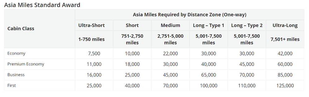 On these routes, the distance-based Cathay Pacific Asia Miles would charge a much higher amount, based on the exact distance flown: the Ultra-Long distance band, where most of these itineraries would fall, will cost you 85,000 Asia Miles in Cathay Pacific business class or 125,000 Asia Miles in Cathay Pacific First Class, with a premium for flying on a partner airline of 5,000 or 10,000 miles, respectively.