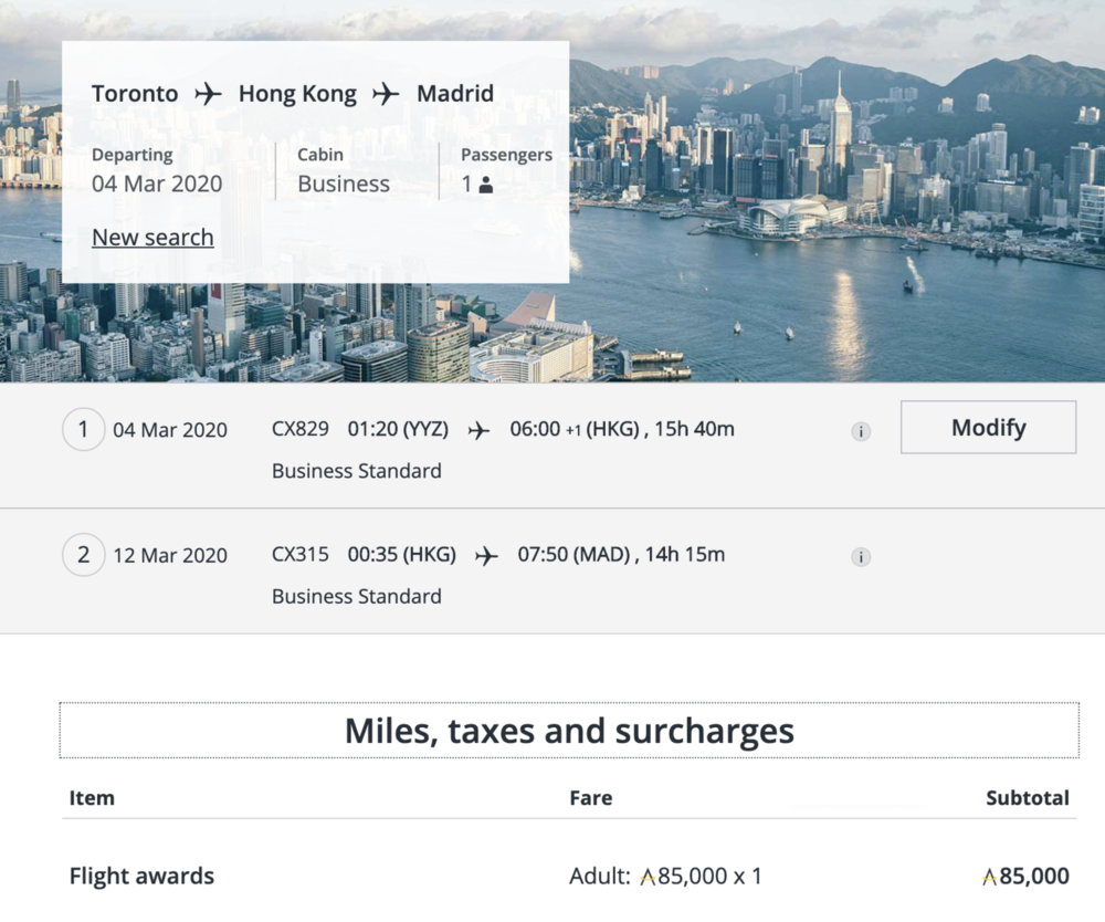 Asia Miles has no such restriction – you’re basically allowed to piece together two Oneworld flights in whichever fashion you want, which leads to several exciting possibilities like booking Toronto–Hong Kong–Madrid on Cathay Pacific, Vancouver–Tokyo–Sydney on Japan Airlines, or even Los Angeles–Sydney–London on Qantas, all with a stopover at the intermediate point.
