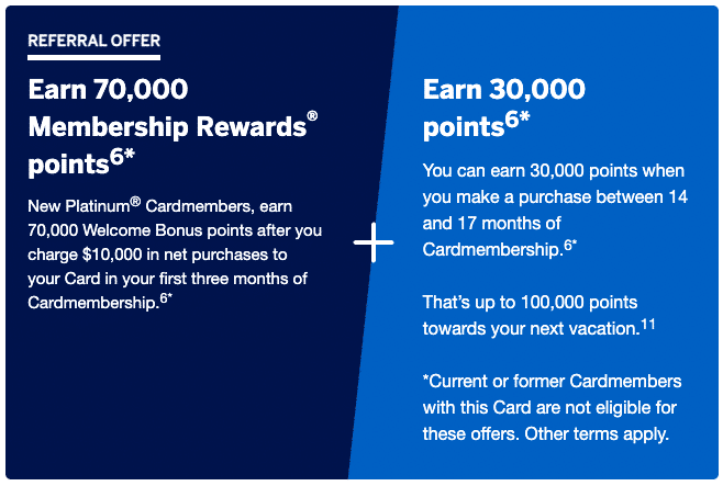 On the personal version of the Platinum card, you can earn up to 100,000 Membership Rewards (MR) points upon meeting the following criteria: