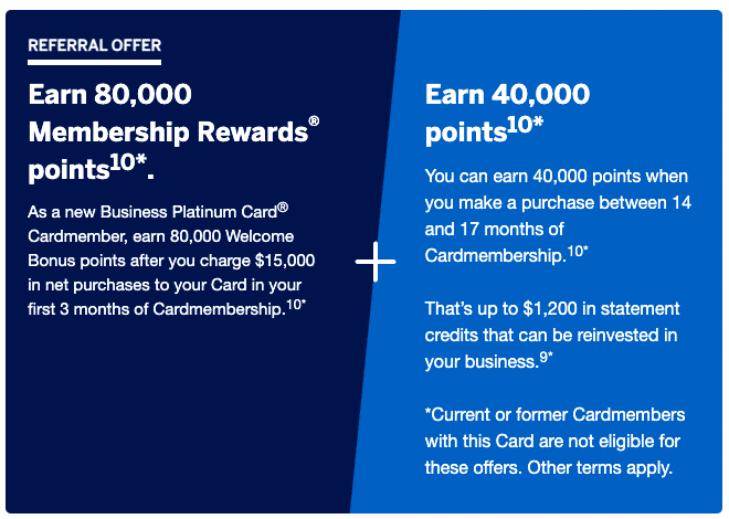 The business version of the Platinum card currently comes with a welcome bonus of up to 120,000 Membership Rewards points upon meeting the following criteria: