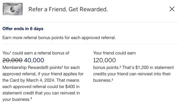However, until March 4, 2024, you’ll earn double referral points on the Business Platinum (40,000 points per referral), and triple referral points on the personal Platinum (30,000 points per referral).