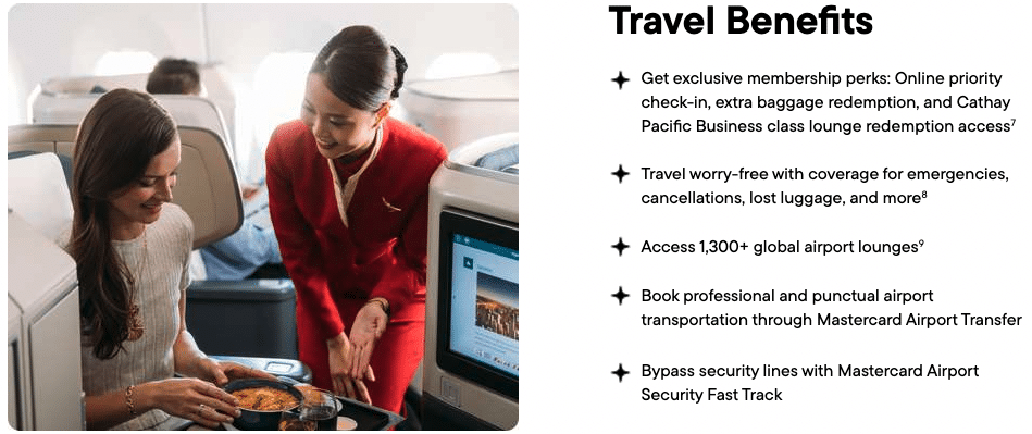 The Cathay World Elite® Mastercard® – powered by Neo advertises that it comes with “exclusive membership perks: priority check-in, extra baggage, and spacious seat selection.” However, these are just the listed benefits offered to anyone for free with an Asia Miles account, and you’d need to redeem Asia Miles or pay cash to get extra bags or better seats.
