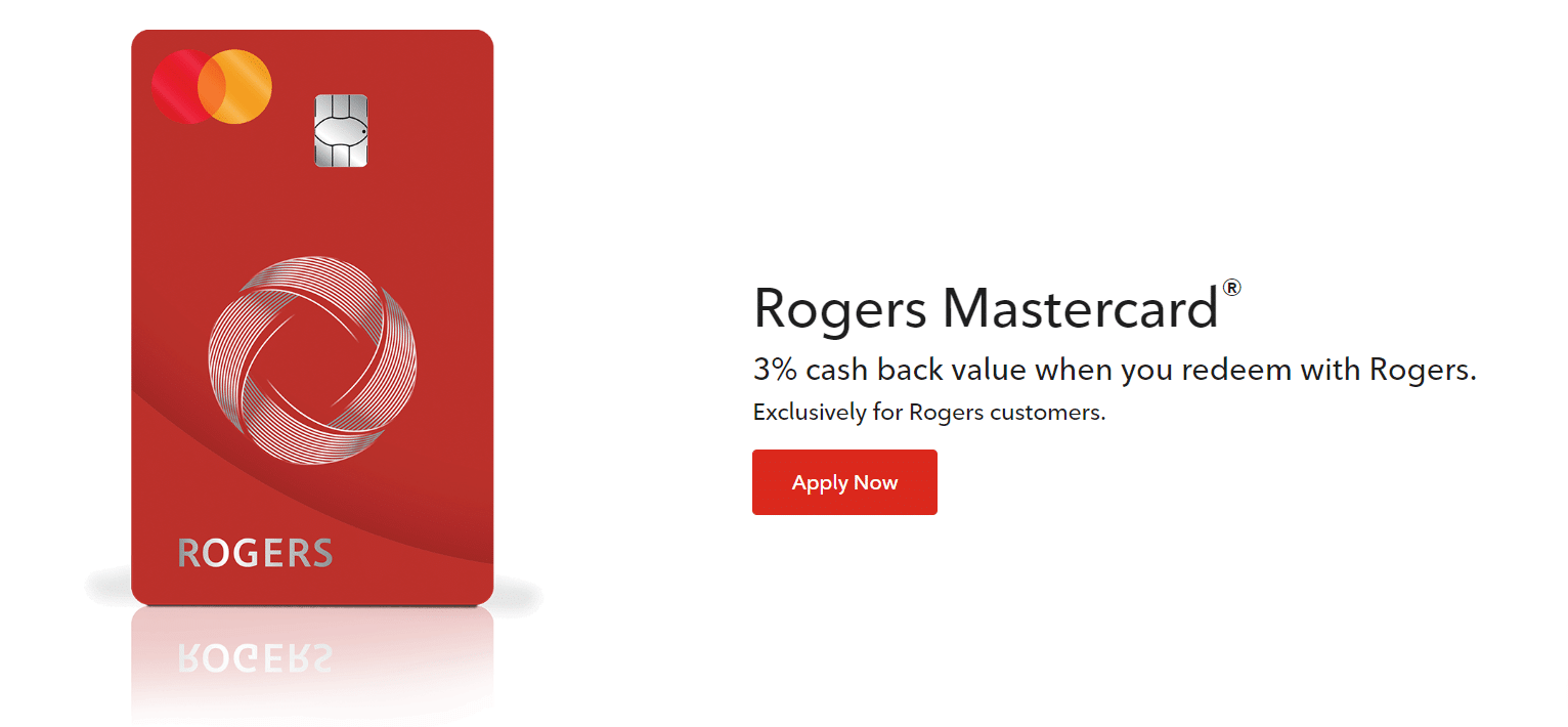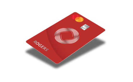 The Rogers Mastercard uses a vertical layout with the company’s signature red and the Rogers logo.