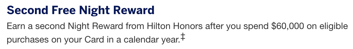 In addition to the free night that you get just for holding the card, you can also earn a second free night every year if you spend $30,000 (USD) on the Hilton Aspire in a calendar year, and a third free night every year if you spend $60,000 in a calendar year.