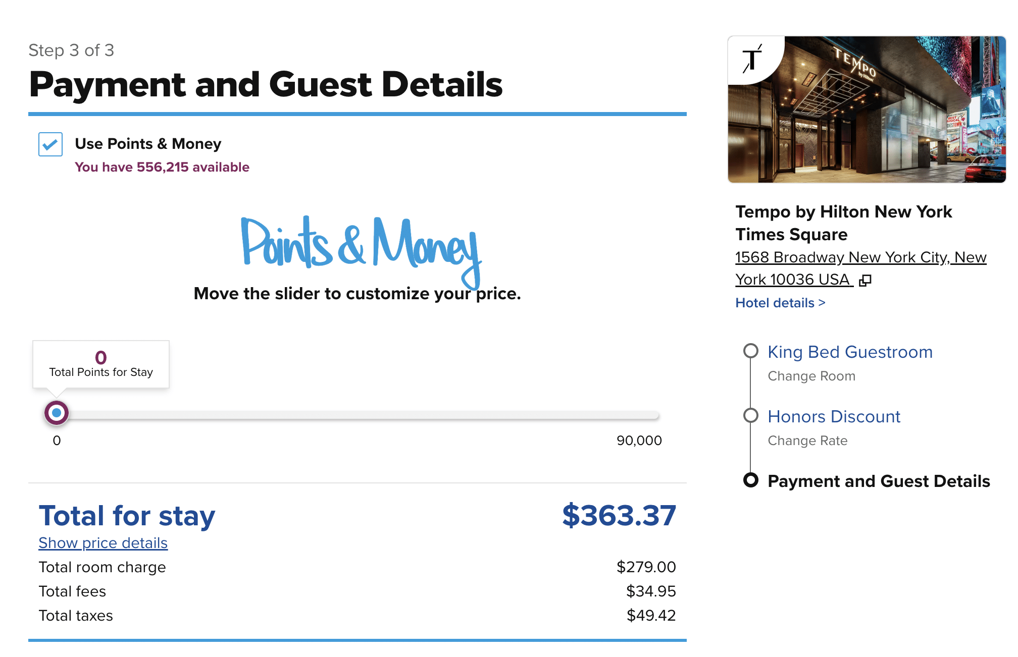 For example, the cost to book one night at the Tempo by Hilton New York Times Square might total $363 or 90,000 Hilton Honors points.
