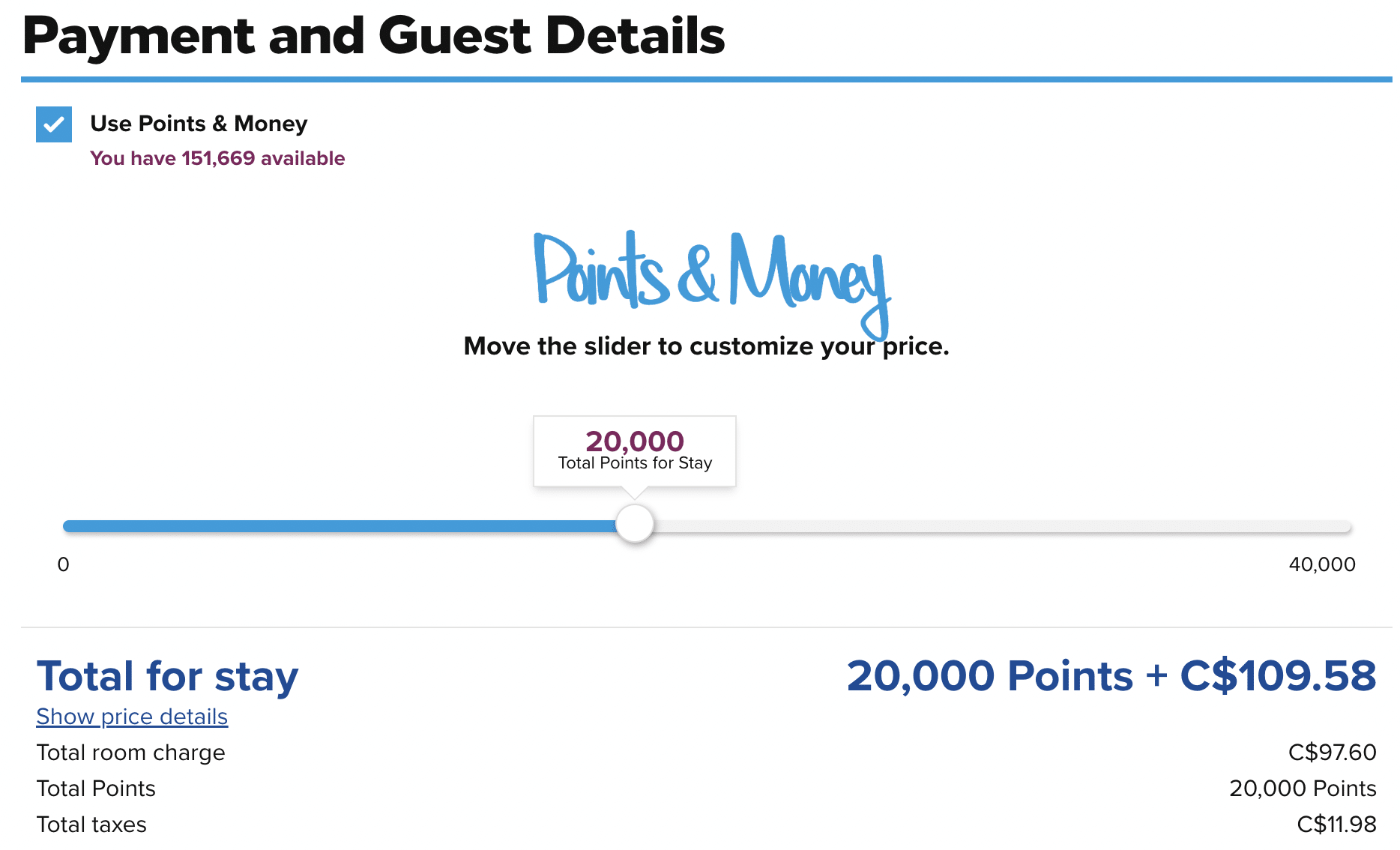 With Points & Money, the amount of cash you save on each booking is proportional to the percentage of points you redeem.