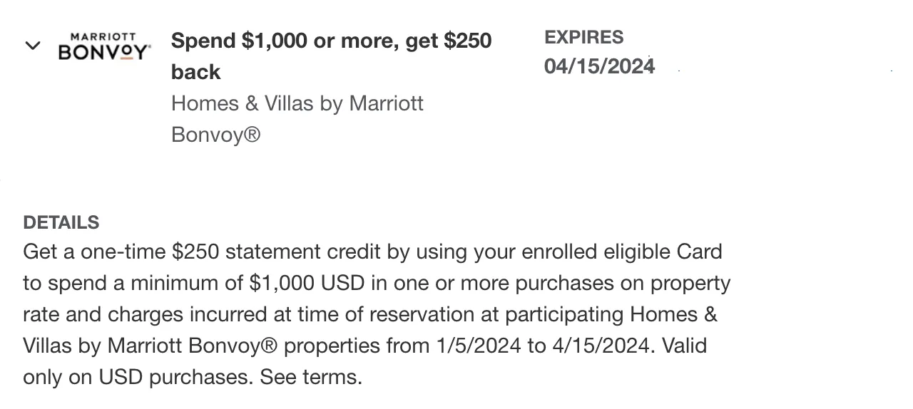 - Amex Offers: $250 off $1,000 spend on Homes & Villas bookings
