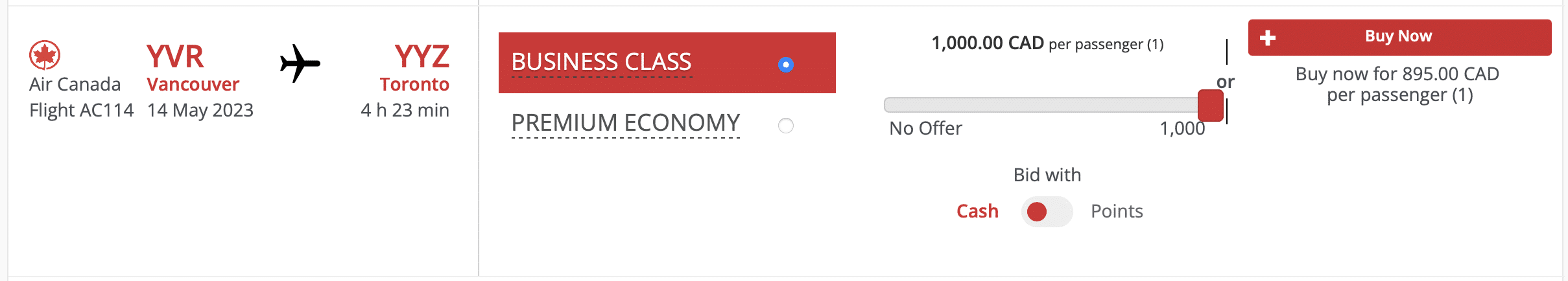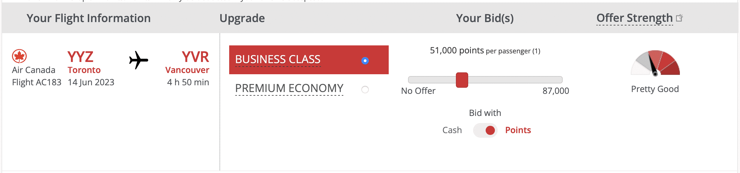 Some airlines will also allow you to bid for an upgrade using frequent flyer points. On the bidding screen, there is a slider that allows you to choose between bidding with cash and points. Both Air Canada and WestJet allow this option, using Aeroplan points and WestJet dollars, respectively.
