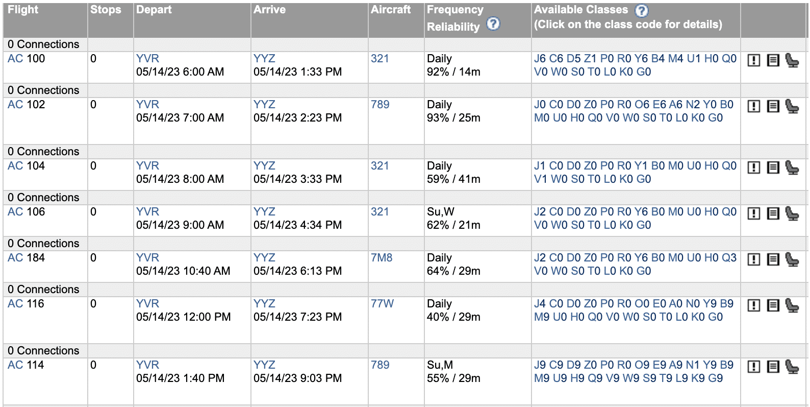 Specifically, you’ll want to see how many seats are left for sale in the higher classes of service, including the fare codes for business class (J, C, D, Z, P) and premium economy (O, E, A).