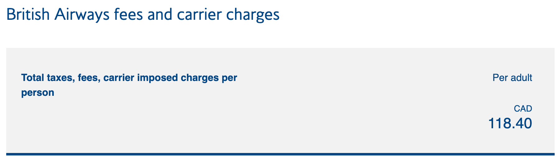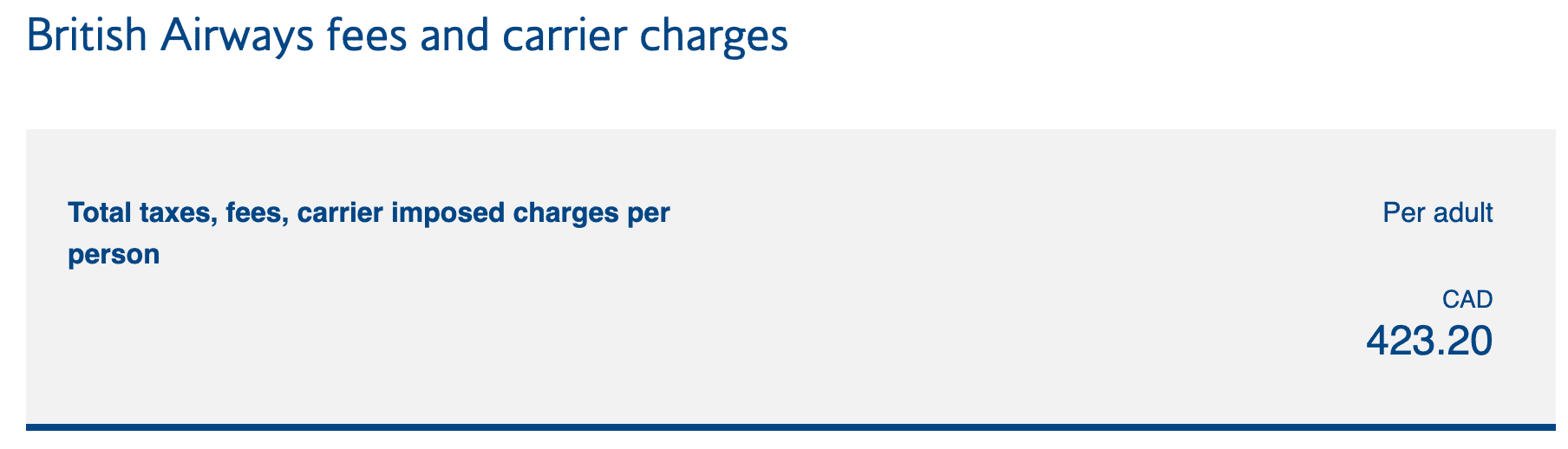 For example, many of us know that British Airways levies fuel surcharges on award bookings and cash bookings. In this example, we see around $423 (CAD) in carrier-imposed surcharges, as well as taxes and fees, for a flight from London to Hong Kong.