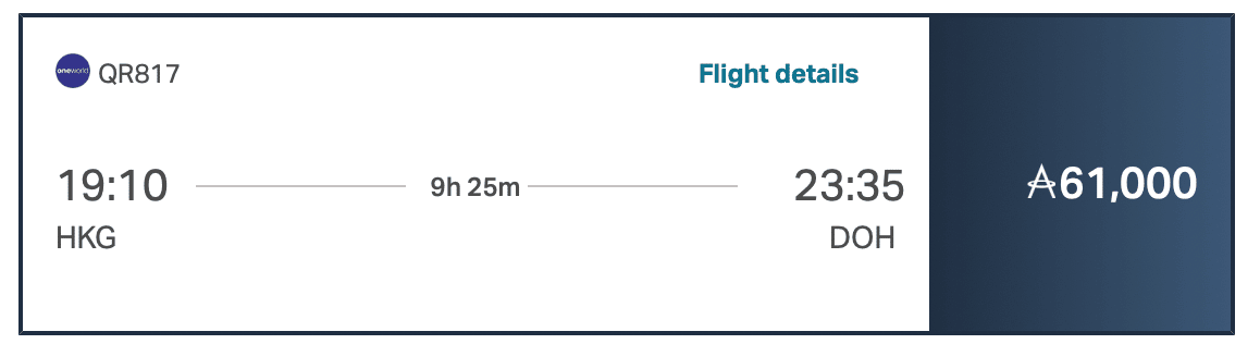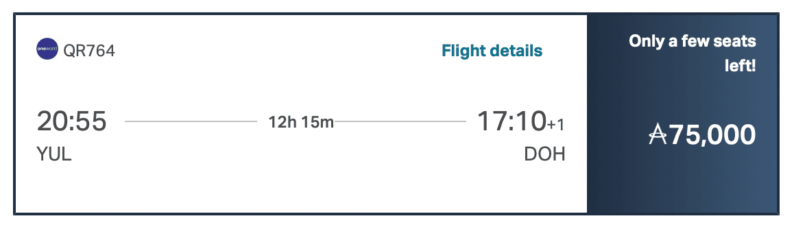 Let’s take an illustrated example, using the Qatar Airways flight from Montreal to Doha that we found on the Asia Miles search engine that we mentioned above.