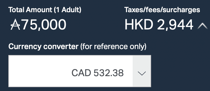 As we can see, both “YQ” and “YR” are carrier-imposed surcharges, and the total amount of taxes and fees, including the carrier-imposed surcharges, is $506.35 (CAD). This is roughly equal to the amount we saw on the Asia Miles website, with some room to account for currency conversions.