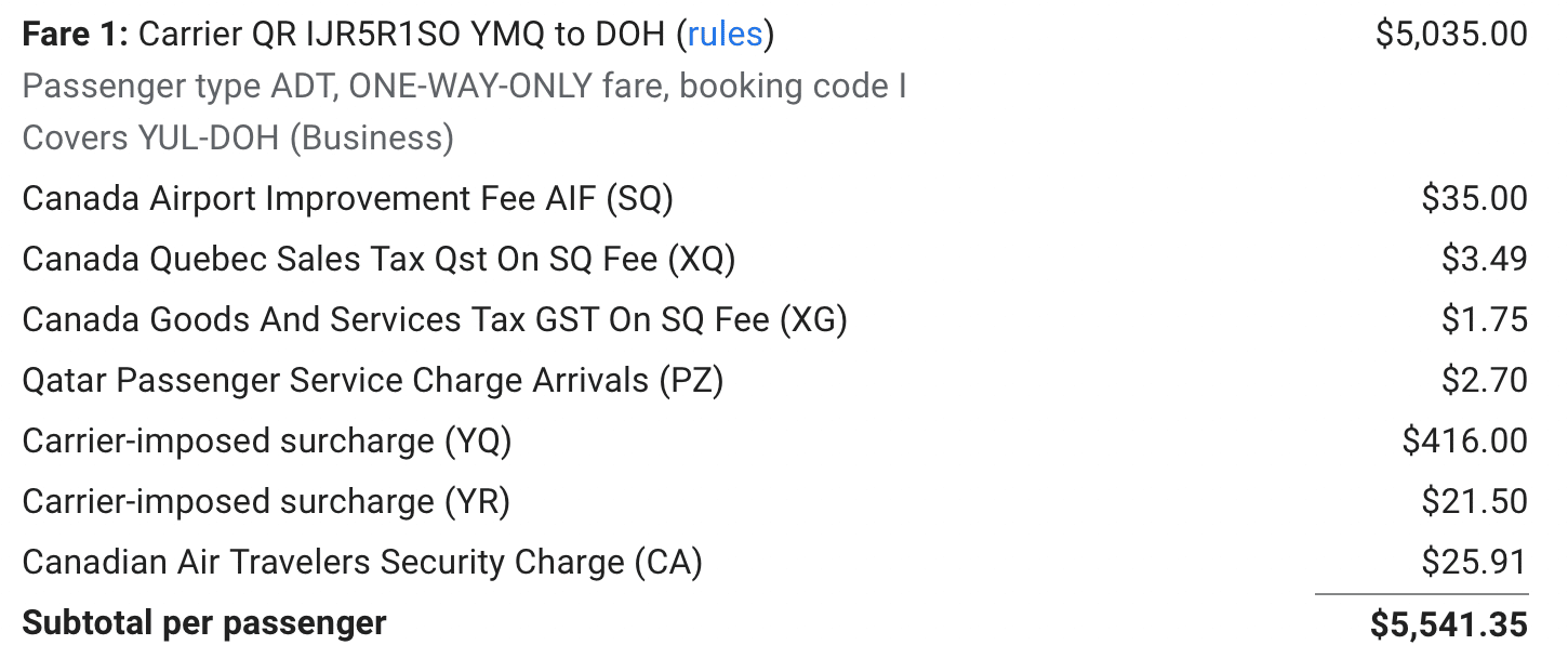 Recently, one member of the Prince of Travel Discord community priced out an itinerary involving Qatar Airways Qsuites and Japan Airlines business class. For a trip with a routing of YUL–DOH–DEL–HND/NRT–BOS, the total amount of taxes and fees, including carrier-imposed surcharges, was a whopping $1,412.75 (CAD).