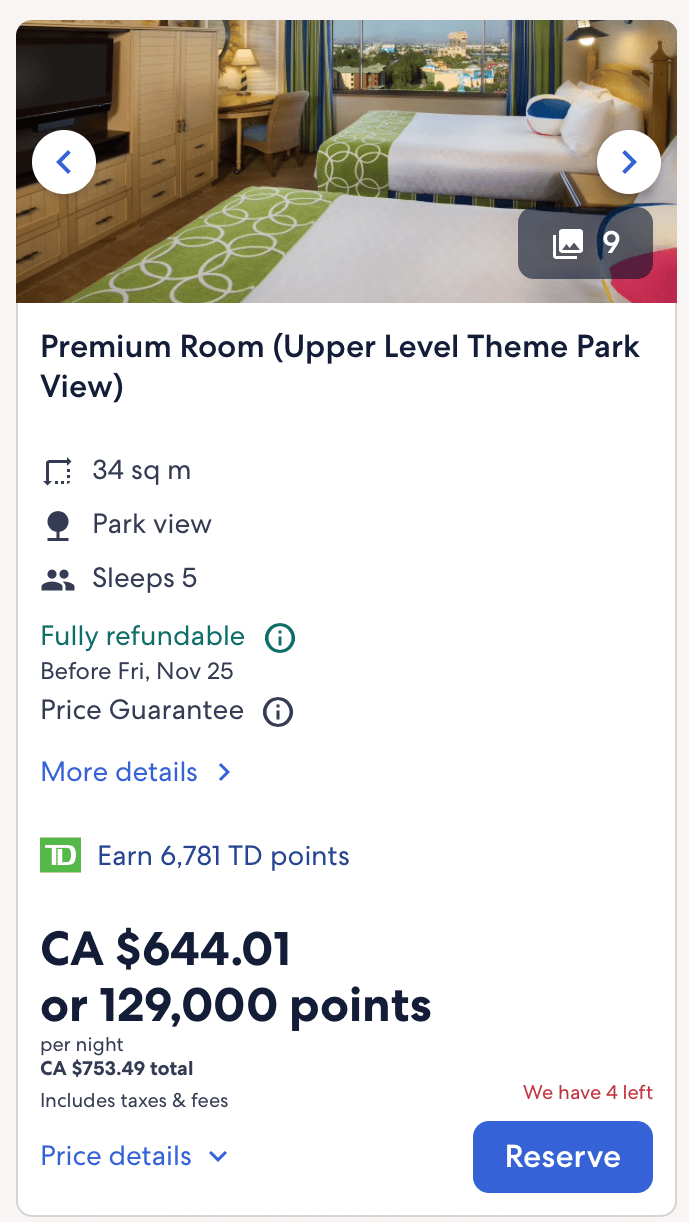 On Expedia for TD, you can book a room for five people at Disney’s Paradise Pier Hotel for $644.01 or 129,000 TD Rewards points. If you don’t have the full amount, you can apply a partial redemption to the booking, effectively reducing the overall cost of your stay.