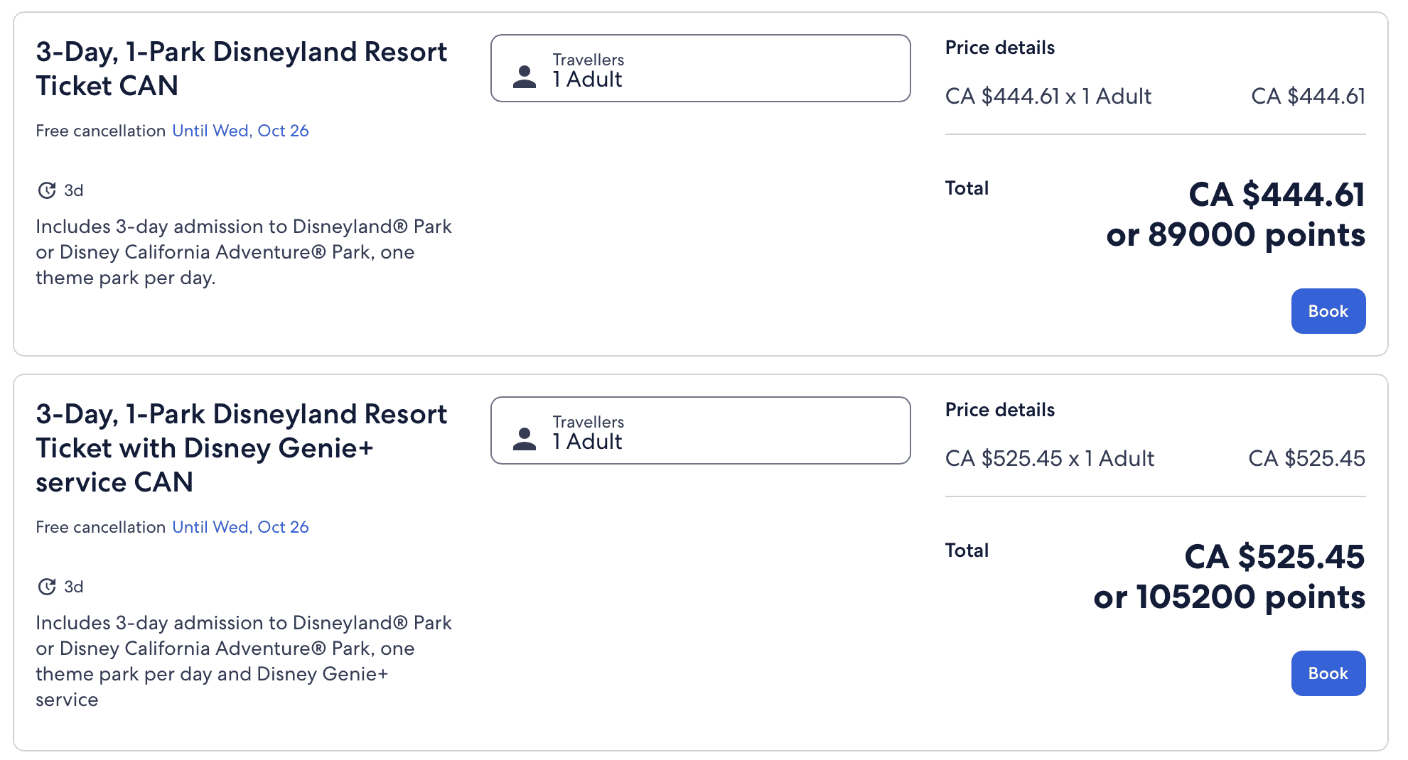 If you’re buying tickets directly from Disney, consider buying a Disney gift card from a grocery store on a credit card that earns 5x the points on grocery purchases to pay for them, so you can at least maximize your earn. There are a few credit options here, including the American Express Cobalt Card, the Scotiabank Gold American Express Card, and the BMO eclipse Visa Infinite Card.