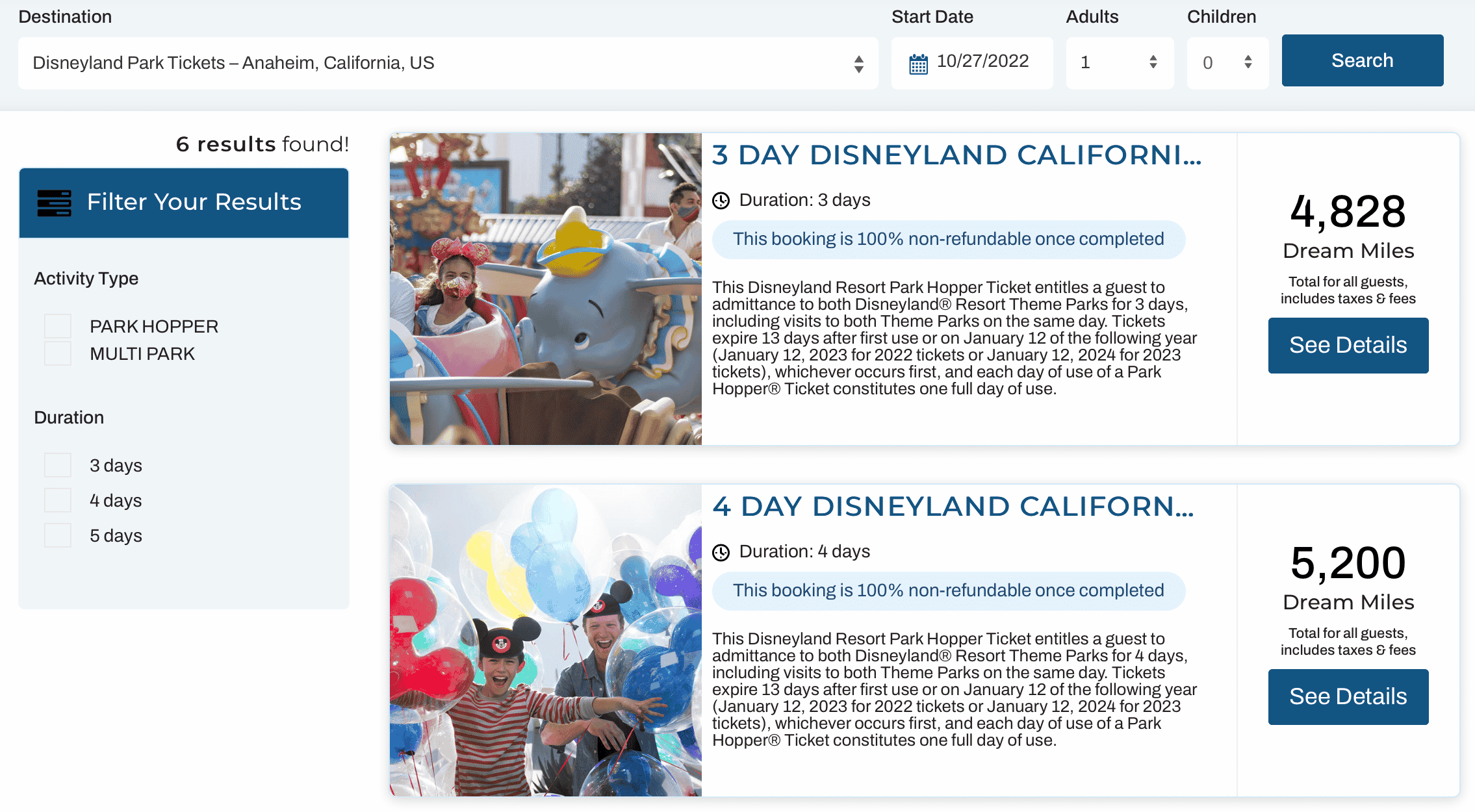 The caveat is that both programs typically only allow redemptions against multi-day tickets of three days or more. Since availability may not be consistent, play around with your park dates to increase your chance of finding ticket availability.