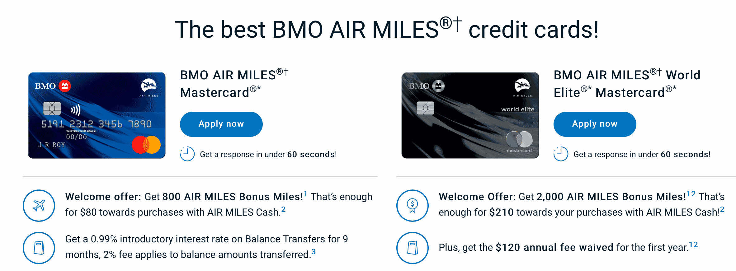 Personally, I’d opt for the BMO Air Miles World Elite Mastercard, which currently has a welcome bonus of 2,000 Air Miles and a waived annual fee.
