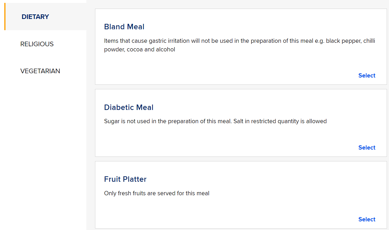 Meanwhile, those with special dietary requirements will want to select something from the Special Meals menu, as they would on any other airline as well: