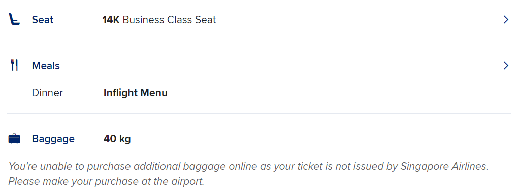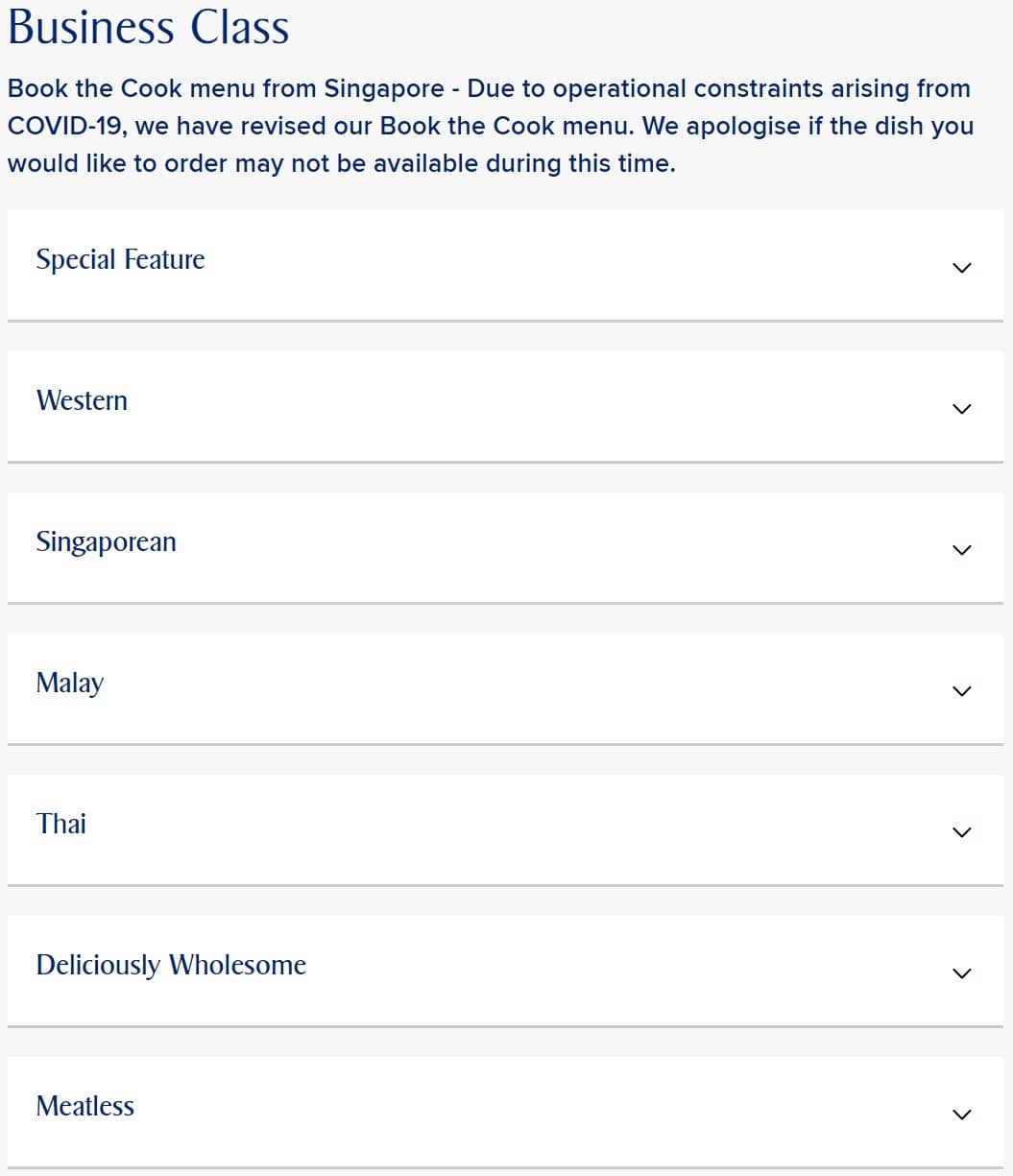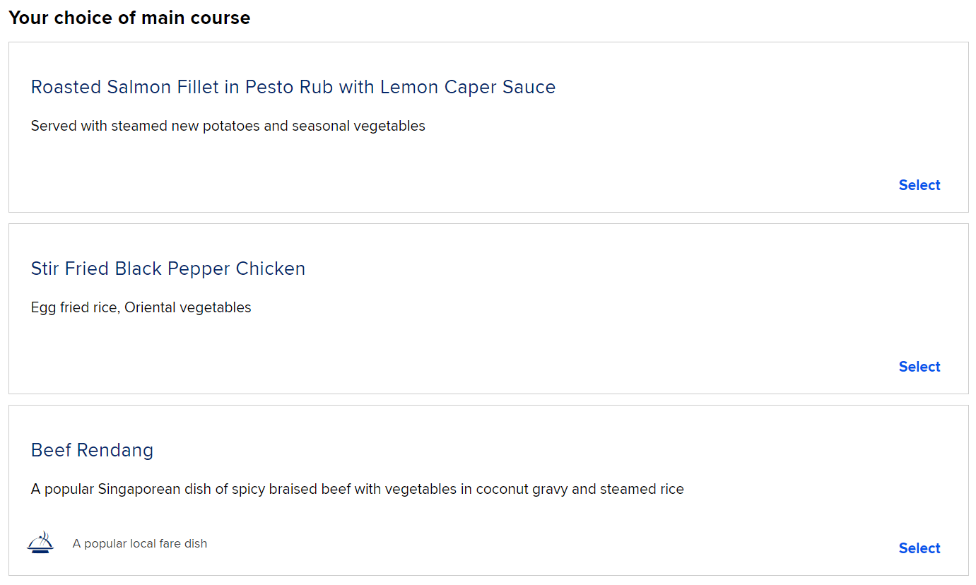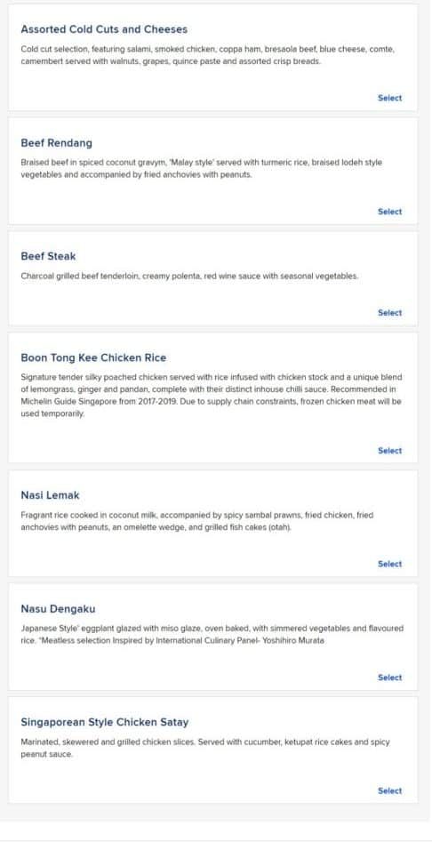 Clicking into Book the Cook, then, you’re presented with the menu from which you can make your selection. Here are all the options for a business class flight from Singapore to Hanoi:
