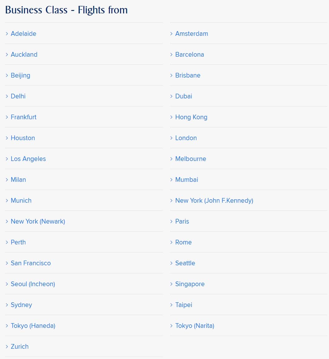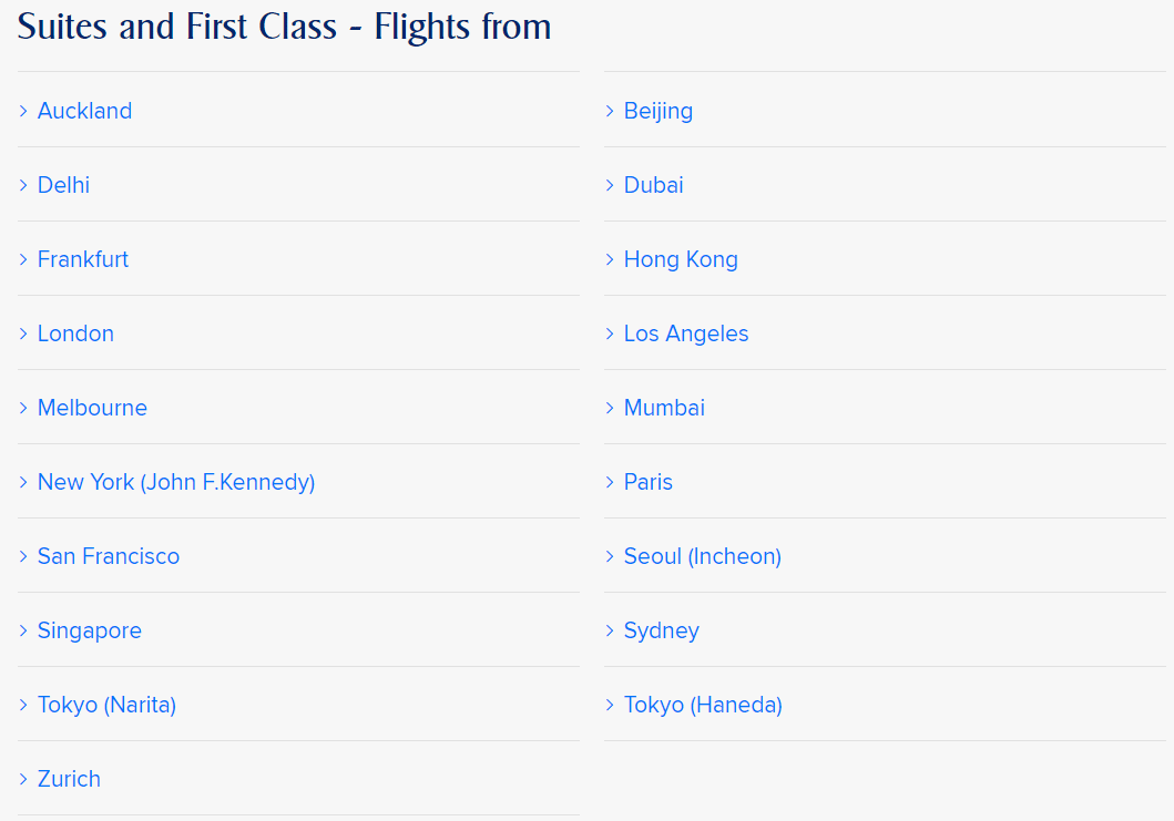 The eligible departure points for Suites Class and First Class passengers are as follows: