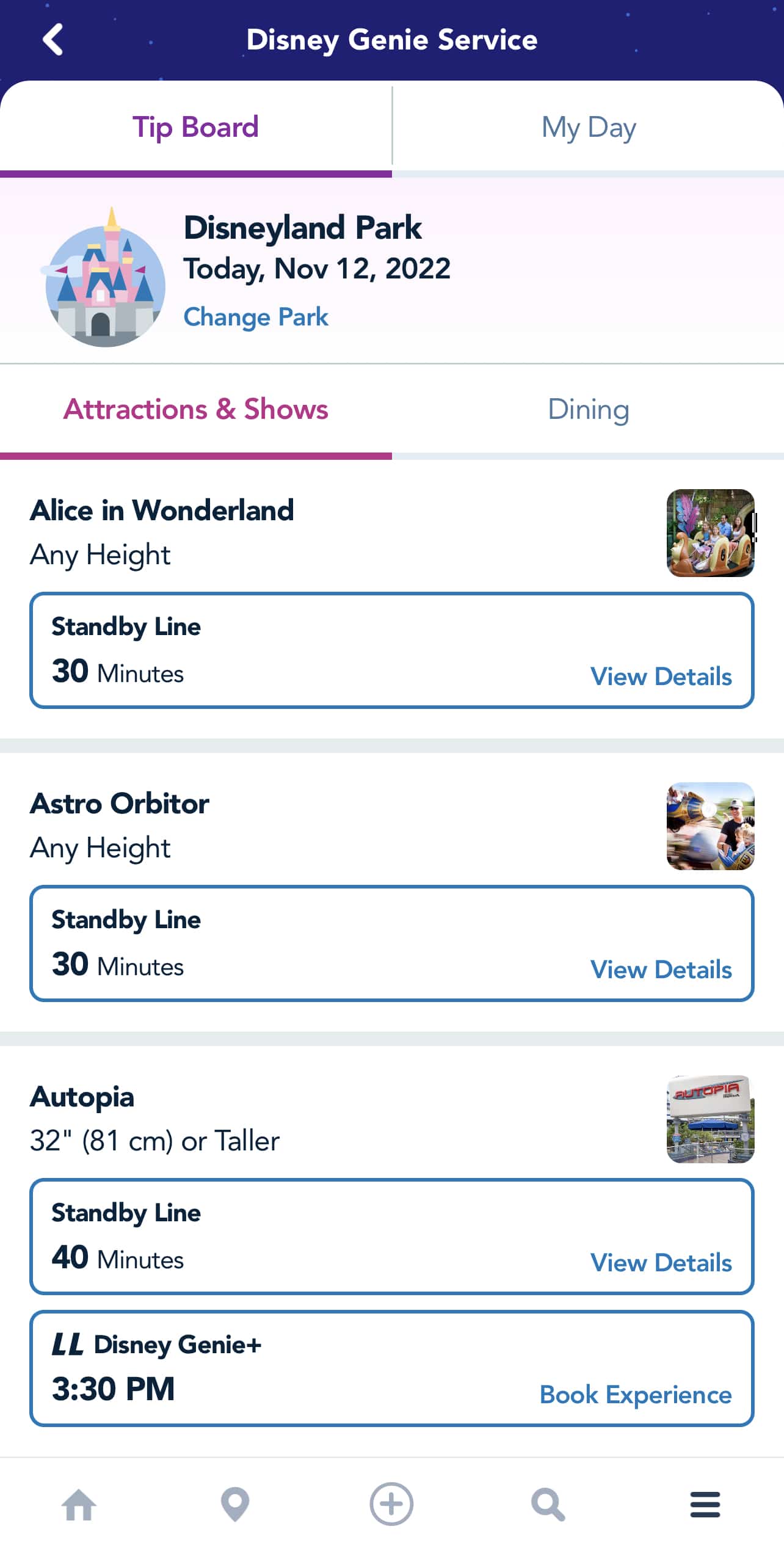 The Genie+ service allows you to choose the next available arrival return time at 11 participating attractions at Disneyland and eight participating attractions at California Adventure Park. You can only have a Genie+ booking for one attraction at a time, and only one booking per day can be made for each attraction.