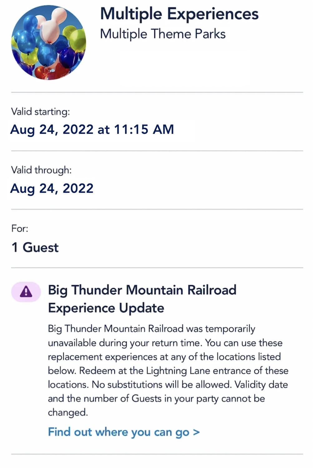 If a ride is down during your return window, you’ve hit the jackpot. Not only can you immediately book a new return time to any other available ride, but the Genie+ system automatically issues you a Multiple Experiences pass that can be used on almost any ride in the park, aside from rides with a paid Lightning Lane.