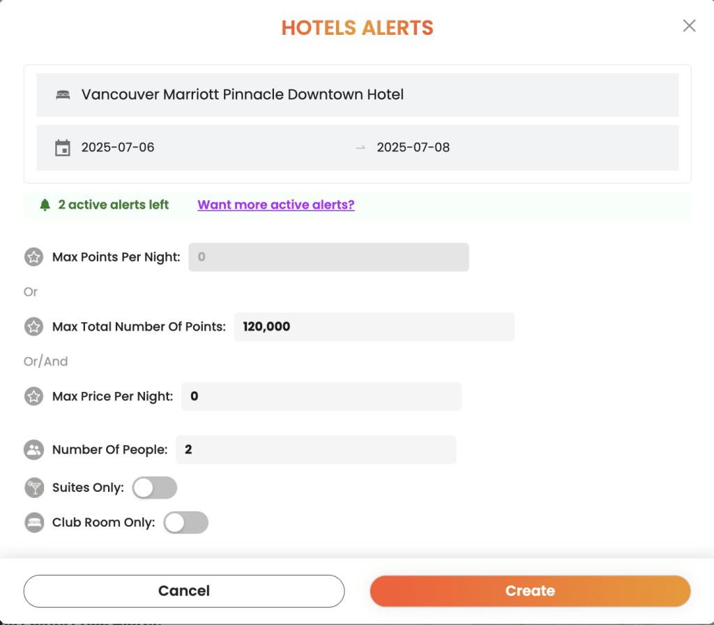 Similarly, if you hold a 35K Free Night Award (FNA) from Marriott Bonvoy and want to use it without topping up additional points, you can set an alert for 35,000 points in your destination city and get notified when any eligible hotel becomes available.