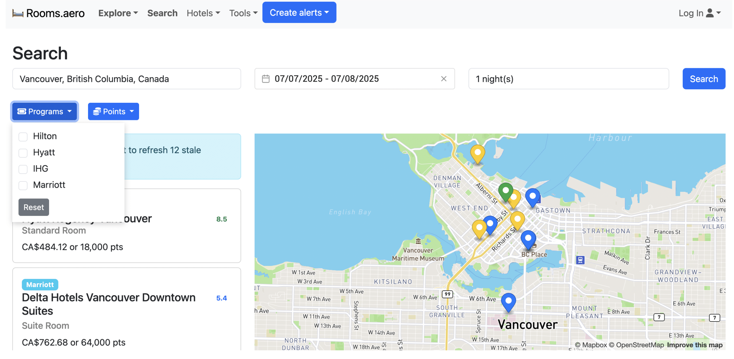 For example, Vancouver Marriott Pinnacle Downtown Hotel is not listed on Rooms.aero, even though it is available on PointsYeah.