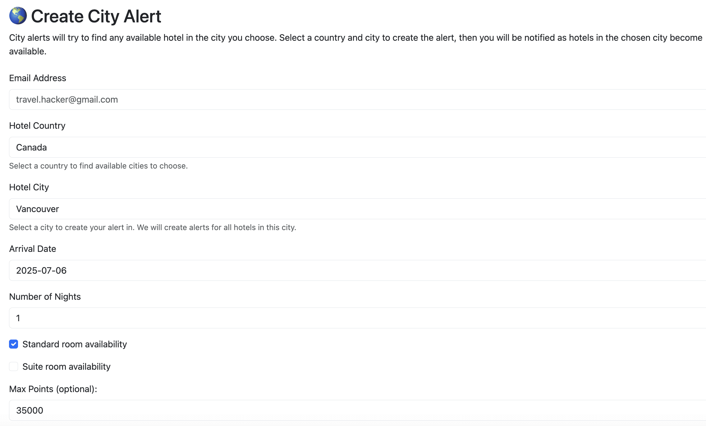 - Tracking All Hotels in a Destination: Get notified when any hotel in a selected city becomes available for points at your chosen price.
