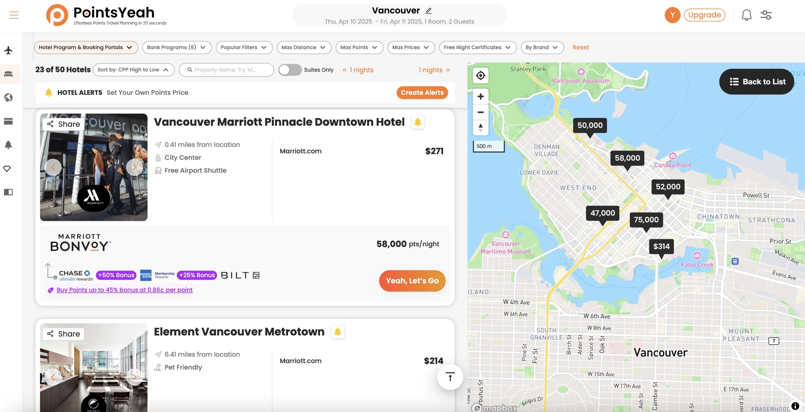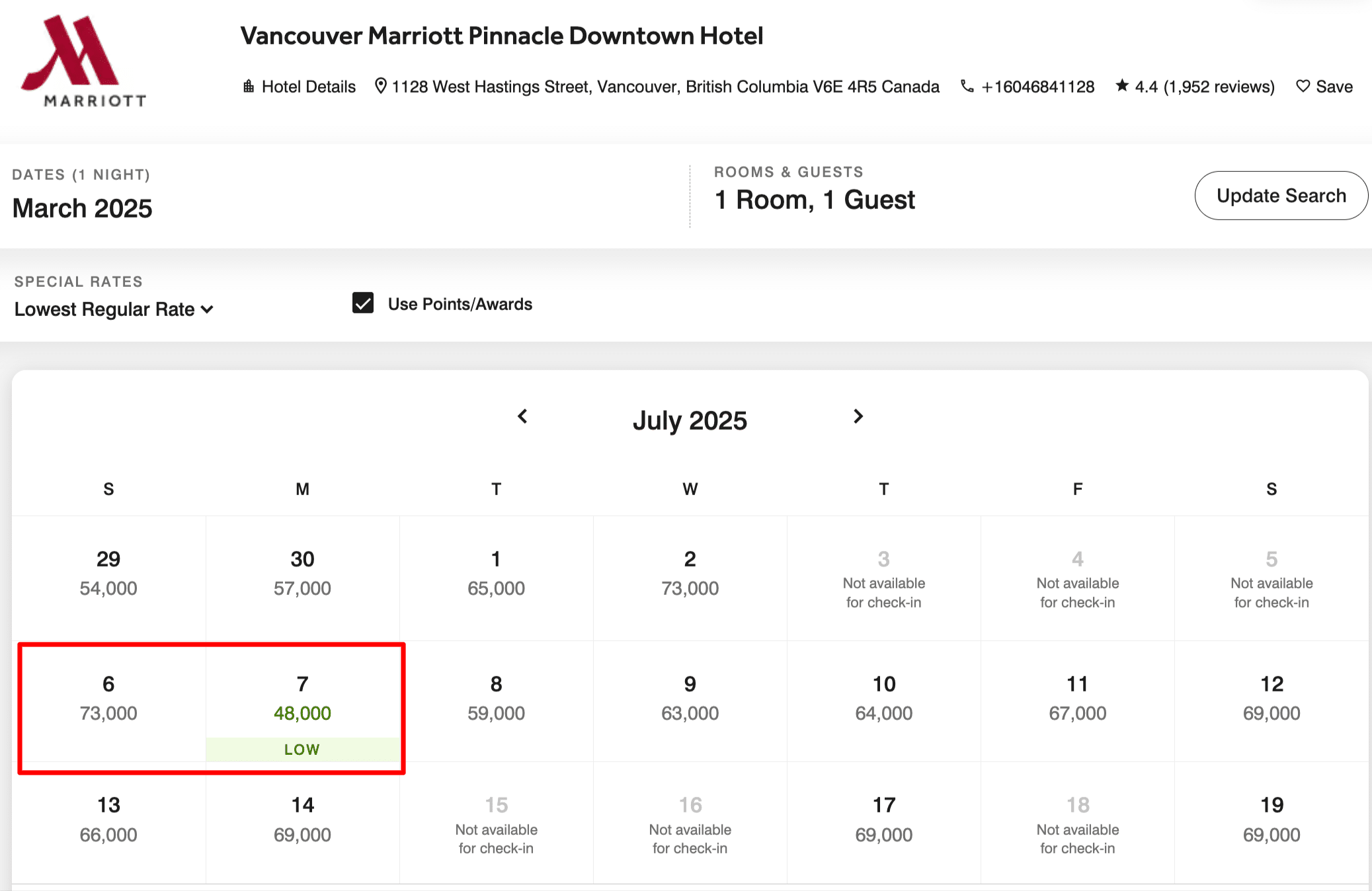 Let’s say you’ve booked a two-night stay at the Vancouver Marriott Pinnacle Downtown Hotel using points.