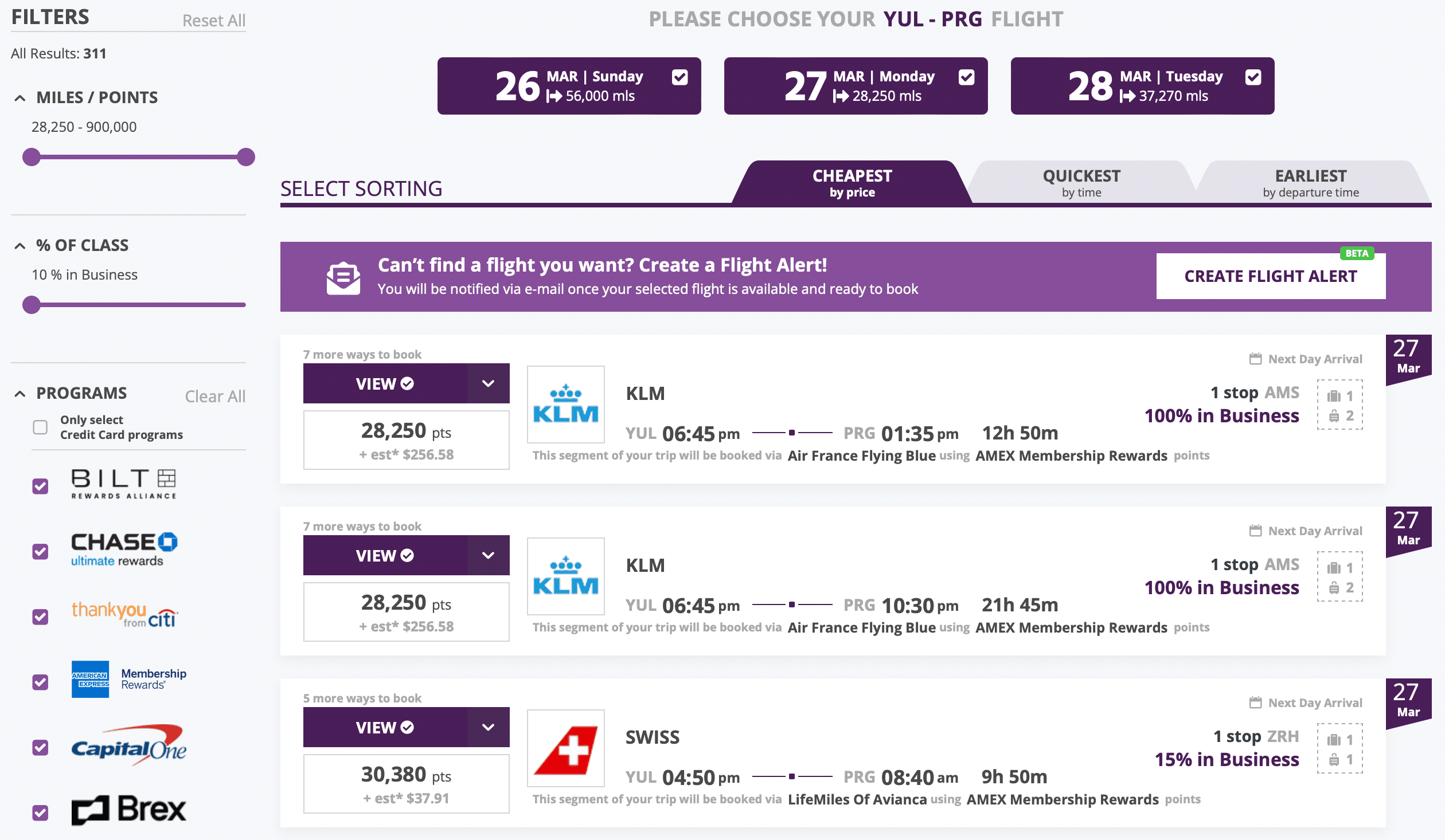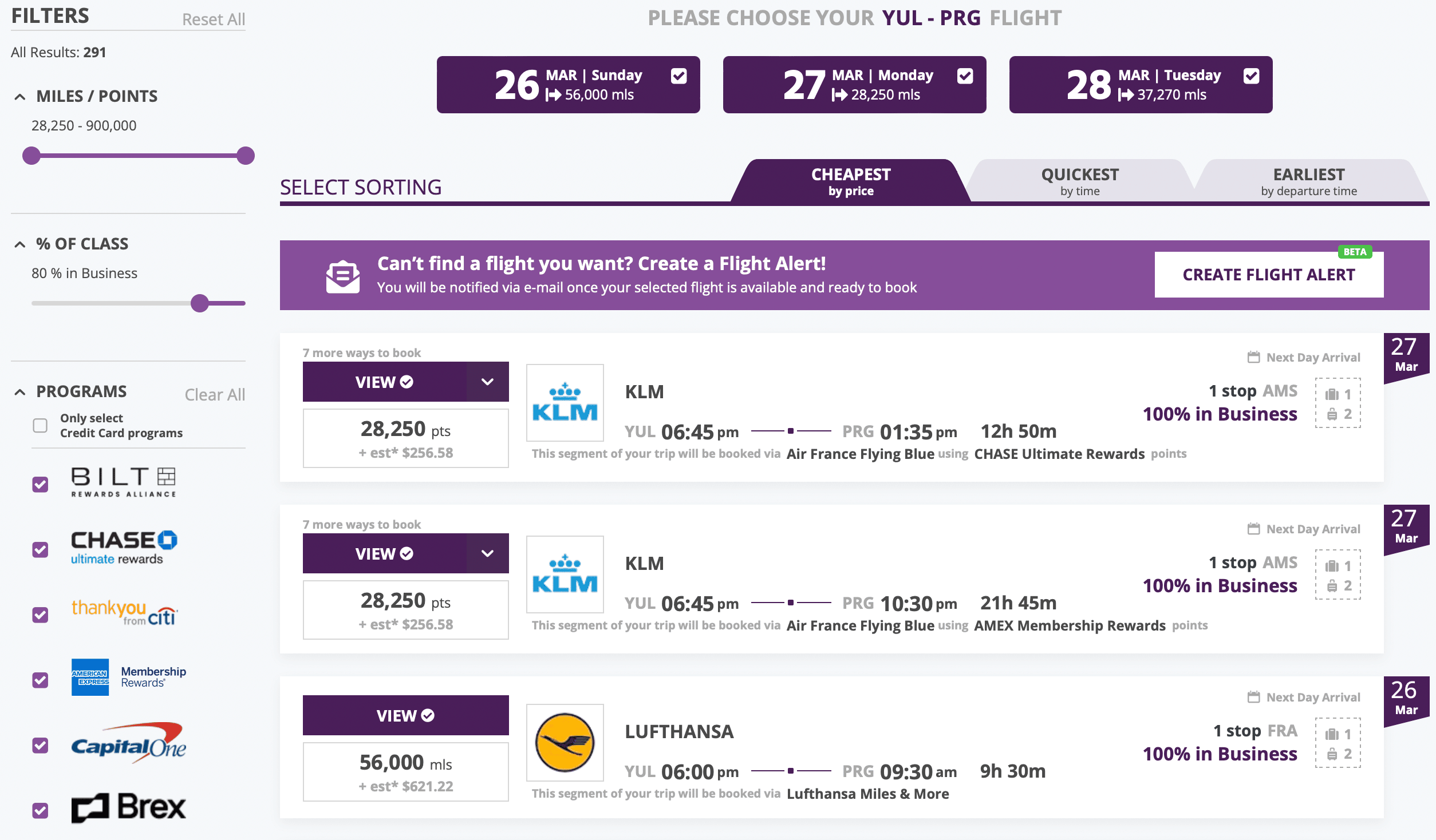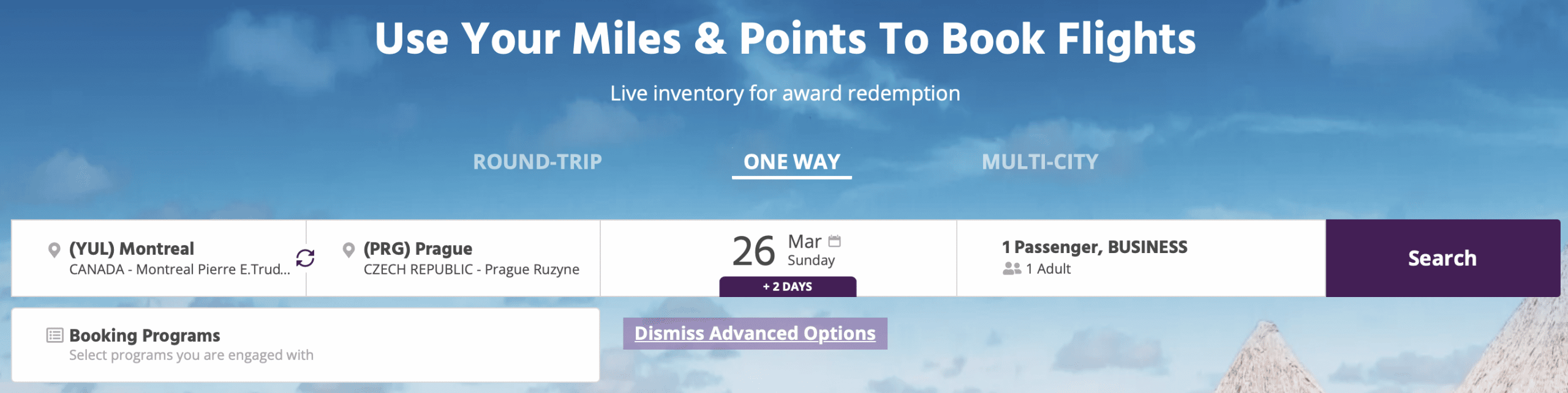 For another example, let’s look at someone who is looking to fly from Montreal to Prague in business class in late March 2023.