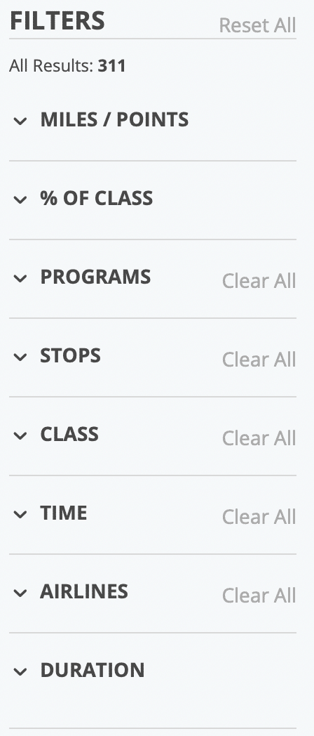 You can filter the results by the number of miles/points, % of class, points programs, number of stops, class of service, time of day, airlines, and duration.
