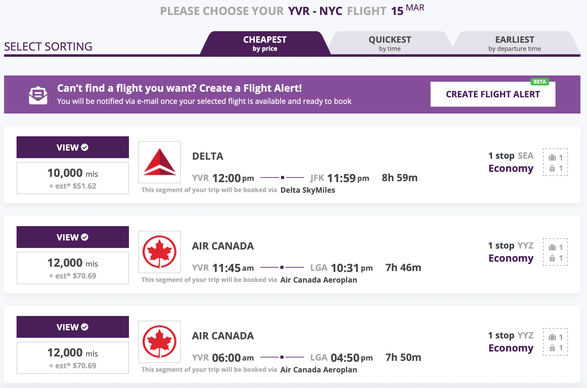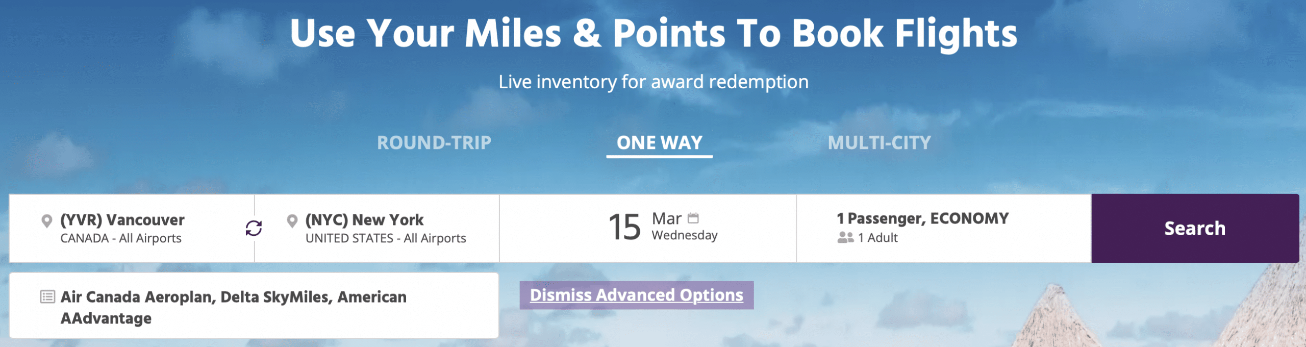 Suppose you have a tidy sum of Aeroplan points, Delta SkyMiles, and American Airlines AAdvantage miles at your disposal, and you wish to see what the best options are for a one-way flight from Vancouver to New York on March 15, 2023.