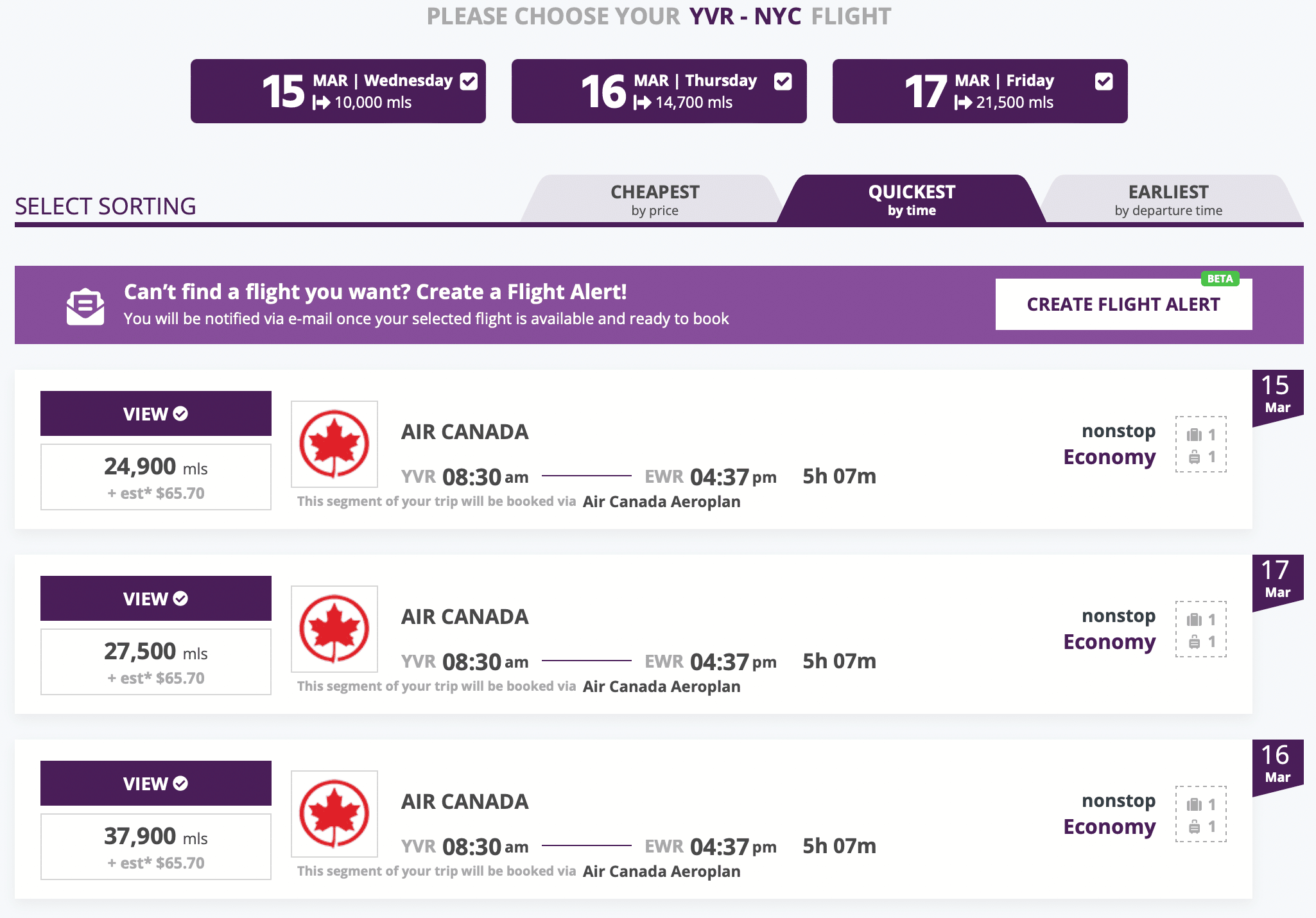 For example, if we select the “Quickest by time” tab, we see the direct flights from Vancouver to New York (EWR) on each of the three days show up at the top of the search results.