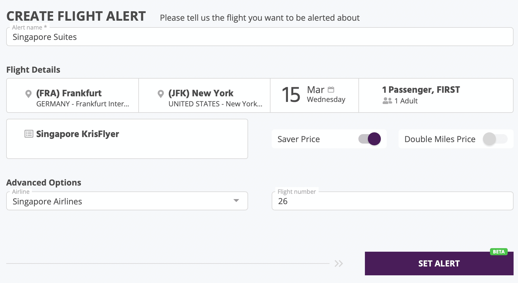 Another great use of flight alerts is for highly sought after award flights. For example, a “Saver” award flight on Singapore Airlines Suites Class is very difficult to come by, even when searching a year in advance.