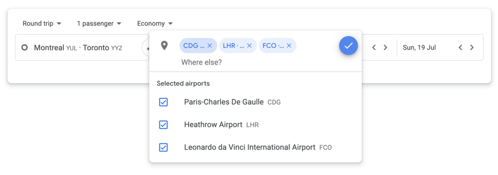 Both fields can also accommodate multiple entries; Google Flights will search across all possible combinations and show you the best results.